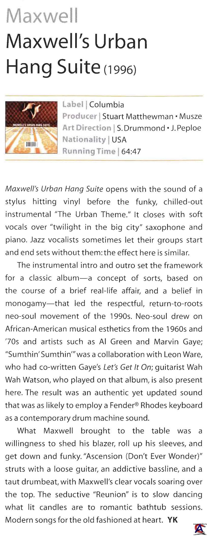 Подробнее Наряду со своими современниками-основателями нео-соул движения, такими как D’Angelo и Erykah Badu, Maxwell сыграл чрезвычайно важную роль в определении и формировании этого стиля, который занял видное положение во второй половине 90-х. Вдохновленный старой школой R&B, такими артистами как Prince, Marvin Gaye, Stevie Wonder и т.д., Maxwell записывал одни из самых честолюбивых R&B-композиций его времени, становясь дико популярным и часто достигая критических точек в этом процессе. Более того, его повторяющаяся тема любовной моногамии выделила его среди огромного числа bump’n’grind исполнителей, поющих о любви. Maxwell родился 23 мая 1973 года в Бруклине, Нью-Йорк; он использовал свое второе имя как сценический псевдоним, сохранив свое настоящее в секрете с целью не беспокоить частную жизнь его семьи. Рожденный от пуэрто-риканца и уроженки Карибских островов, уже в возрасте трех лет Maxwell понес потерю своего отца, который погиб в авиакатастрофе. Этот случай сделал из него очень религиозного ребенка, и впервые он начал петь в баптистской церкви. Тем не менее, он не относился к музыке серьезно пока ему не исполнилось 17 лет, когда он начал писать свои собственные песни на простой клавишной панели Casio, которую ему подарил друг. Он быстро прогрессировал, имея первоначальное влияние urban R&B ранних 80-х, и к 1991 году он выступает на сцене нью-йоркского клуба, несмотря на насмешки со стороны одноклассников, которые и представить не могли, что застенчивый неуклюжий подросток сможет сделать что-то подобного рода. И после того, как он сделал себе имя, в 1994 году он подписывает звукозаписывающий контракт с Columbia. В этом году он записывает свой дебютный альбом, над которым работали: автор текстов Leon Ware, который был соавтором большинства материала c альбома Marvin Gaye’я «I Want You» 1976 года; гитарист Wah Wah Watson, который так же работал с Marvin Gaye’ем; и мультимузыкант Stuart Matthewman долгое время работавший с Sade. В 1996 году выходит его первый студийный альбом «Maxwell’s Urban Hang Suite», который по началу не спешил раскупаться. Ситуация меняется, когда выходит второй сингл альбома «Ascension (Don’t Ever Wonder)», ставший хитом и принесший известность альбому и самому Maxwell’у. В результате было продано более 2 млн. копий, альбом заработал статус дважды платинового и номинировался на Grammy. 15 июня 1997 года в Нью-Йорке Maxwell дает свой концерт на MTV, исполнив как свои песни, так и каверы на песни: Kate Bush «This Woman’s Work» и Nine Inch Nails «Closer», после чего выпускает MTV Unplugged EP, в который вошли восемь композиций, из которых Unplugged версия песни «Whenever, Wherever, Whatever» номинировалась на Grammy в номинации Best Male Pop Vocal. Второй студийный альбом «Embrya» был выпущен 30 июня 1998 года. Он стартовал в Billboard 200 (U.S.) на третьем месте, был номинирован на Grammy в номинации «Лучший R&B альбом», но проиграл альбому Erykah Bsdu «Baduizm». В 1999 году альбом получил награду Soul Train Music как лучший мужской Soul/R&B альбом. В этот же год Maxwell выпускает один из самых успешных синглов «Fortunate», написанный R.Kelly. Сингл имел гигантский успех и был R&B-хитом #1 в текущем году. Релиз третьего альбома Maxwell’а «Now» пришелся на 2001 год. Это был его первый альбом, занявший первые места как в Billboard 200, так и в Billboard’s R&B чартах, включая сингл «Lifetime» и студийную версию «This Woman’s Work». После перерыва в 8 лет, 7 июля 2009 года Maxwell выпускает свой четвертый альбом «BLACKsummers’night», стартовавший на первом месте в Billboard 200.