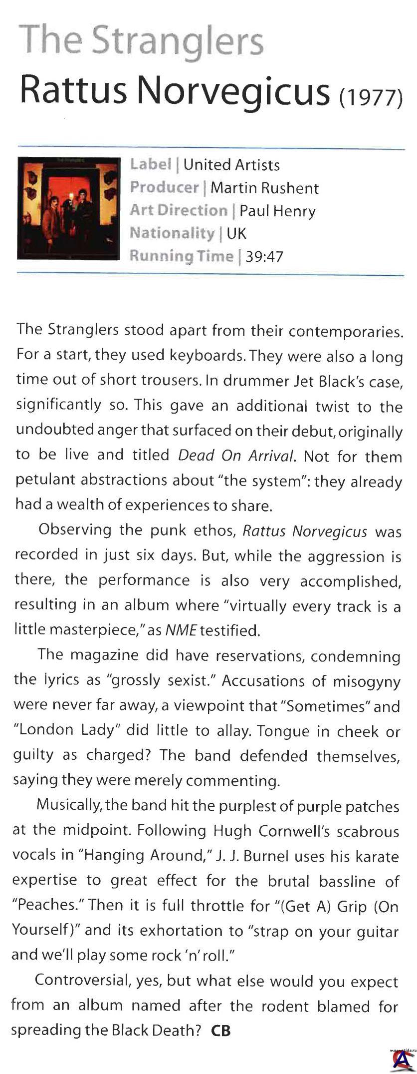 Подробнее Первоначально планировалось выпустить дебютный альбом концертным, но запись, сделанная в конце 1976-го на концерте в Нэшвилле, не устроила группу. Тогда сыграли то же самое в студии. Вполне в духе панковской этики, альбом был записан всего за шесть дней. По сути, это — слепок с того что представляла собой группа Stranglers живьем в свой самый панковский период. Но при всей своей агрессивной живости и кажущейся спонтанности, альбом поражает отточенностью аранжировок и уникальным звуком. Как гласил обзор в журнале NME: "практически каждая вещь в альбоме — маленький шедевр." Rattus Norvegicus спродюссировал Мартин Рашент, работавший звукоинженером еще с начала 1970-х с такими группами как T. Rex, Fleetwood Mac и Yes. Как самостоятельный продюссер он начал работать с панк-группами, такими как Buzzcocks, Generation X, XTC, 999 и The Stranglers, и надо отдать должное: это плотное брутальное мужское звучание Rattus Norvegicus, составляющее всю прелесть альбома и вообще ранних Stranglers — во многом заслуга Рашента. Альбом поднялся до 4-го места и продержался в британском хит-параде 34 недели. Это был самый популярный альбом в Британии панковской эпохи, который можно сравнить только с секспистоловским Never Mind The Bollocks. ИСТОРИЯ The Stranglers — удивительная группа, ярко воплотившая в жизнь квинтэссенцию панк-рока, его самые характерные черты: грубое звучание, буйную "отвязанную" энергию, выразительный музыкальный примитивизм, подростковый нигилизм в текстах — в то же время стоит особняком от "типично панковских" команд. Оглушительный успех Sex Pistols внушил массе молодых британцев мысль, что любой из них может выйти на сцену, имея только ярость в груди да ирокез на голове, спеть и сыграть, никогда не учившись этому. Более того, считалось даже зазорным уметь хорошо играть и воспроизводить сложные гармонии. В принципе, это была естественная реакция молодежи на заполонивший 1970-е годы прогрессивный рок (или арт-рок), который, в бесконечном стремлении к усложнению музыки, завел в тупик и убил первобытный живой и веселый рок-н-ролл. The Stranglers выгодно отличались на этом фоне. Пропитанные лучшими традициями прогрессивного рока, они сумели соединить их с живой энергией и идеей панк-рока. Они не носили ирокезы, не плевались в публику и не протыкали себя насквозь булавками, но несли в своих ранних альбомах самый настоящий панковский дух. В отличие от тысяч групп, бравших за эталон панк-рокера образ "своего в доску парня" Сида Вишеса, все участники The Stranglers были хорошо образованы и имели определенный музыкальный и жизненный опыт. Главный вокалист и лидер-гитарист группы Хью Корнуэлл закончил факультет биохимии Бристольского университета и уехал заниматься исследованиями в этой области в Лундский университет — старейший и престижнейший вуз на юге Швеции. В свободное от науки время он сформировал там группу под названием Johnny Sox, где с ним играли — преимущественно блюз — два американца, сбежавших в Европу от призыва в американскую армию и один швед. Хью вскоре разочаровался в биохимии и не на шутку увлекся музыкой. Он убедил согруппников уехать в Лондон — центр рок-движения, по крайней мере, европейского. Брайан Даффи в 1970-х годах был успешным бизнесменом. Он был основателем и владельцем пивоваренной компании, занимавшейся оптовой и розничной продажей своей продукции как в Англии, так и за рубежом. Кроме того, у него бы