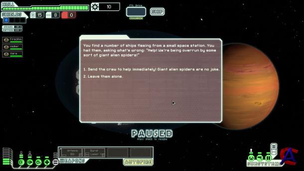 Особенности игры: * Комплексный стратегический геймплей - отдавайте приказы команде, распределяйте энергию по кораблю, направляйте оружие в уязвимые точки противников. * Играйте на своей скорости - делайте паузу во время боя, чтобы продумать дальнейшую стратегию и отдать приказы. * Уникальные формы жизни и Технологии – улучшайте свой корабль и открывайте новые с помощью шести различных инопланетных рас. * Будьте настоящим Капитаном - сотни опасных ситуаций будут заставлять вас принимать сложные решения. * Случайная галактика - в каждом прохождении вас ожидают различные враги, события, и результат ваших решений. Двух одинаковых прохождений не будет. * Нет второго шанса! - если кто-то из вашей команды погибнет, то его уже не вернуть. Постоянная угроза поражения придает важность и интригу каждому вашему действию.
