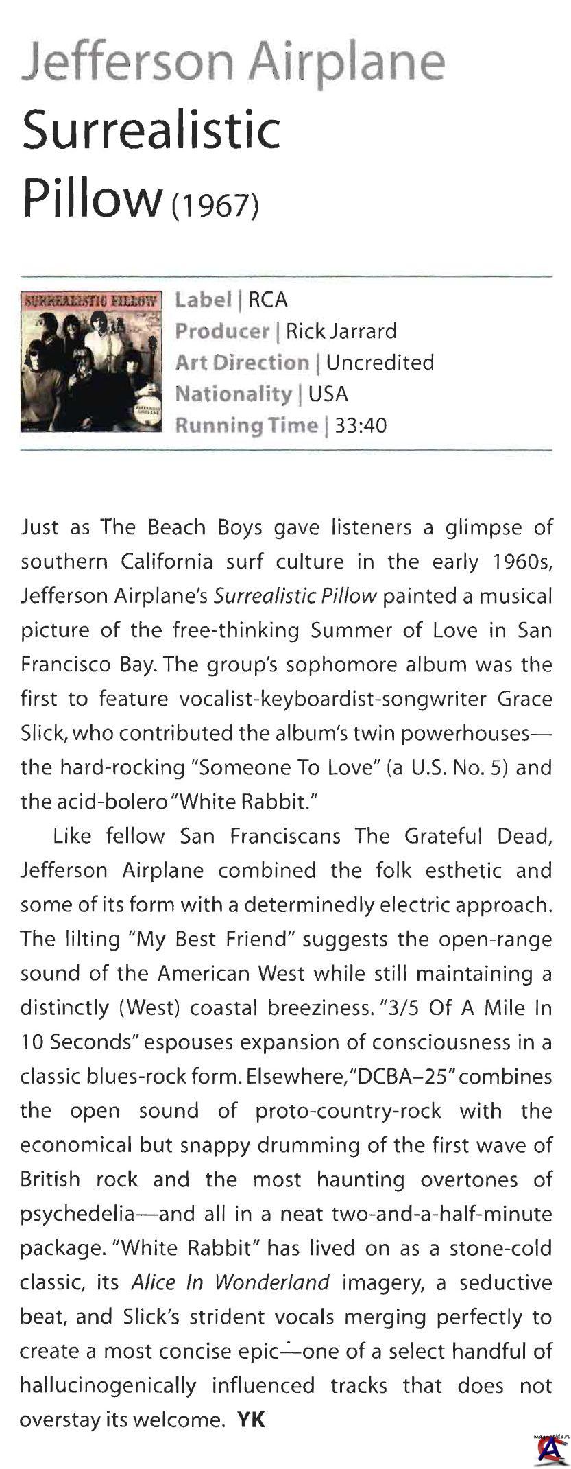 Трэклист Surrealistic Pillow (Remastered Stereo Version) 1 She Has Funny Cars 3:03 2 Somebody To Love 2:54 3 My Best Friend 2:59 4 Today 2:57 5 Comin" Back To Me 5:18 6 3/5 Of A Mile In 10 Seconds 3:39 7 D.C.B.A. — 25 2:33 8 How Do You Feel 3:26 9 Embryonic Journey 1:51 10 White Rabbit 2:27 11 Plastic Fantastic Lover 2:33 Surrealistic Pillow (Original Mono Version) 12 She Has Funny Cars 3:03 13 Somebody To Love 2:54 14 My Best Friend 2:59 15 Today 2:57 16 Comin" Back To Me 5:18 17 3/5 Of A Mile In 10 Seconds 3:39 18 D.C.B.A. — 25 2:33 19 How Do You Feel 3:26 20 Embryonic Journey 1:51 21 White Rabbit 2:27 22 Plastic Fantastic Lover 2:33