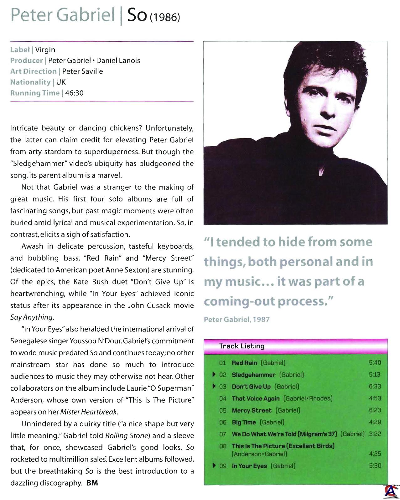 Трэклист CD1 — Original Album Remastered 1. Red Rain 2. Sledgehammer 3. Don"t Give Up 4. That Voice Again 5. Mercy Street 6. Big Time 7. We Do What We re Told (Milgram"s 37) 8. This is the Picture (Excellent Birds) 9. In Your Eyes CD2 — Live In Athens 1987 1. This is the Picture (live) 2. San Jacinto (live) 3. Shock the Monkey (live) 4. Family Snapshot (live) 5. Intruder (live) 6. Games Without Frontiers (live) 7. No Self Control (live) 8. Mercy Street (live) 9. The Family and the Fishing Net (live) CD3 — Live In Athens 1987 1. Don"t Give Up (live) 2. Solsbury Hill (live) 3. Lay Your Hands on Me (live) 4. Sledgehammer (live) 5. Here Comes the Flood (live) 6. In Your Eyes (live) 7. Biko (live) CD4 — So DNA (work in progess song drafts) 1. Red Rain 2. Sledgehammer 3. Don"t Give Up 4. That Voice Again 5. Mercy Street 6. Big Time 7. We Do What We re Told (Milgram"s 37) 8. This is the Picture (Excellent Birds) 9. In Your Eyes