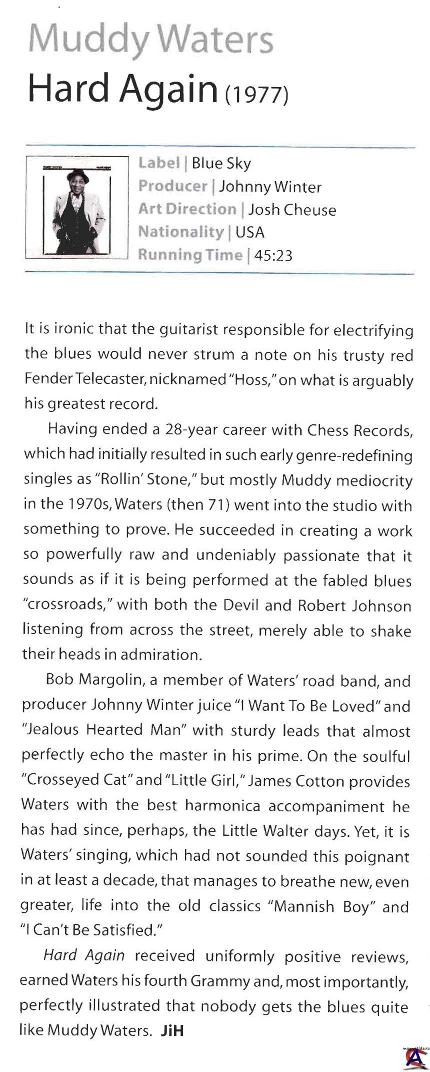 Подробнее Из всех бесчисленных факторов и влияний, сформировавших музыкальный пейзаж сегодняшней Америки, одним из самых значимых остается южноамериканский блюз конца 40-х — начала 50-х. Сердце современного блюза начало биться в послевоенном Чикаго, посылая импульсы как в пространстве, так и во времени, влияя как на дальнейшее развитие и популяризацию этого стиля, так и на судьбу фактически всей последующей музыки. Кто бы мог предположить, что скромно изданный в 1948 году сингл автора и исполнителя Мадди Уотерса получит такой беспрецедентный резонанс?.. Уотерс улучшил звучание своей гитары с помощью маленького приспособления — он использовал усилитель, который придал инструменту неожиданно мощный, объемный, впечатляющий звук, а традиционные мелодии зазвучали по-новому волнующе и интересно. Это было не единственное новшество, которое Мадди Уотерс привнес в послевоенный блюз, в большей или меньшей степени предопределив расстановку музыкальных сил до конца столетия. Неслучайно Rolling Stones одолжили название у одной из ранних записей Уотерса, чье творчество — посредством тех же "Роллингов" и множества учившихся у него музыкантов — срезонировало на десятилетия вперед. Как и многие его современники, раскрывшие свои таланты на бурной музыкальной сцене Чикаго, Мадди Уотерс, а точнее, Маккинли Морганфилд (McKinley Morganfield) — дитя плодовитой дельты реки Миссисипи. Он родился 4 апреля 1915 года в Роллинз Форке, штат Миссисипи. С трех лет, после смерти матери, он жил у бабушки на плантации Стовалл (Stovall) в окрестностях Кларксдейла, в ста милях к северу. Жизнь на этой обездоленной, при всей своей щедрости, земле протекала в безрадостном тяжелом труде. Работать Маккинли начал еще ребенком, нанимаясь помощником фермера. В 13 лет он научился играть на губной гармошке — с этого инструмента начинался путь многих великих блюзменов. Спустя четыре года у него появилась своя гитара. Образцом для подражания стал для подростка Сан Хаус (Son House), патриарх дельта-блюза, чью манеру игры и устрашающую интенсивность исполнения он преобразовал на свой лад. Другим бесспорным музыкальным кумиром американского юга был Роберт Джонсон (Robert Johnson), мастер характерного гитарного аккомпанемента, особой техники звукоизвлечения, благодаря которой гитара превращалась в изумительное продолжение голоса. Резкий, рельефный, пульсирующий гитарный стиль Сана Хауса и Роберта Джонсона, поразивший юного Маккинли Морганфилда, после года интенсивных занятий не представлял для Маккинли уже никакой сложности. Он освоил и мощную, очень экспрессивную вокальную манеру, характерную для блюзменов дельты Миссисипи, вкладывавших в свое пение всю боль и ужас, все отчаяние и страсть, все те разочарования и безысходность, которыми было переполнено их существование, балансировавшее между жизнью и смертью. Решительный поворот в судьбе молодого музыканта, уже пробовавшего свои чары на публике, наступил в 1941 году, когда в те края по поручению библиотеки Конгресса США приехал музыковед Алан Ломакс (Alan Lomax). Его главной задачей было найти и записать игру Роберта Джонсона (он ушел из жизни за три года до приезда Ломакса, о чем музыковедам было неизвестно), а кроме того, ему поручили высматривать новые таланты. Главной находкой Ломакса и оправданием всех затрат на эту экспедицию стал Маккинли Морганфи