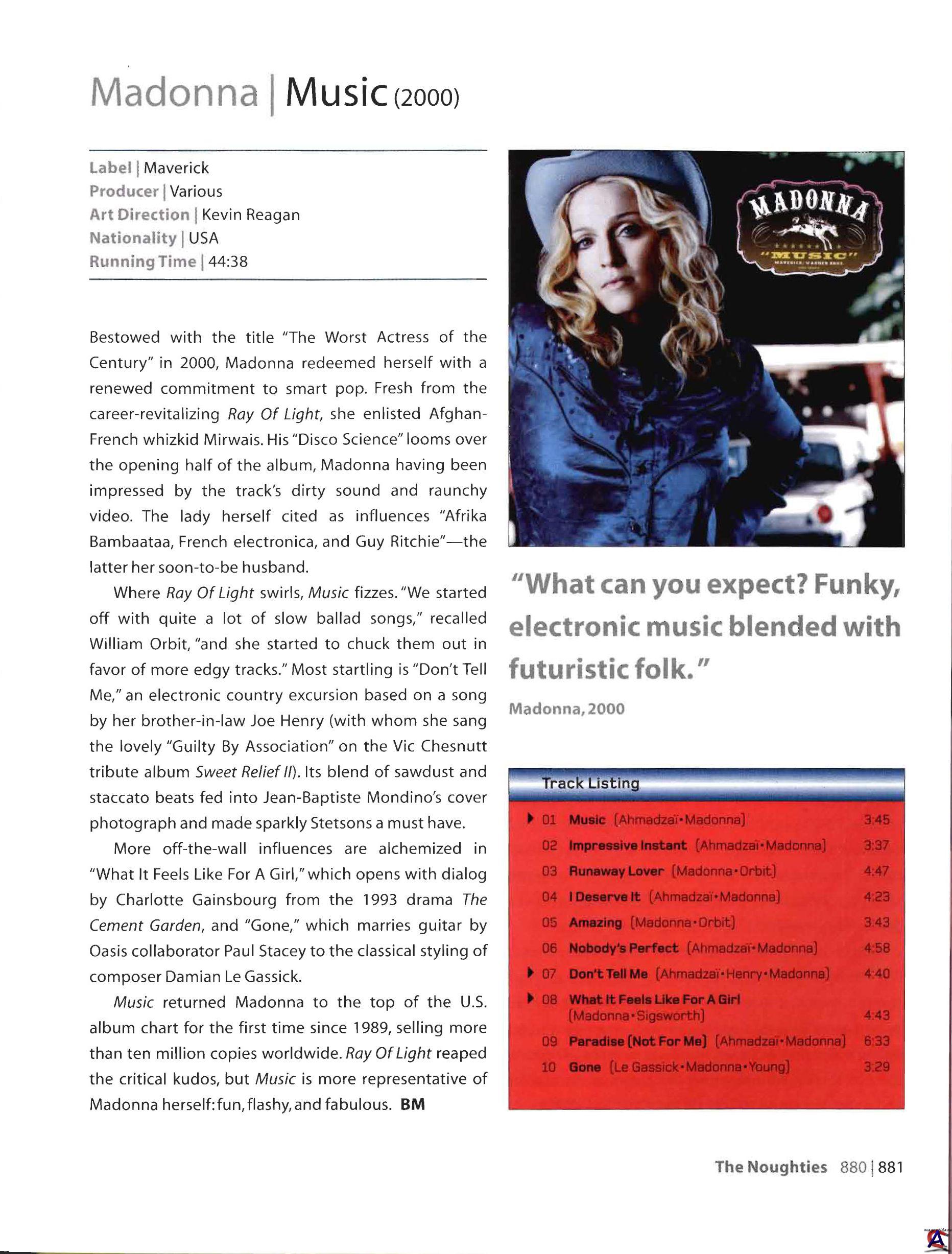Подробнее Международный успех альбома 1998 года Ray of Light Мадонна сумела превзойти с выпущенным в 2000 году альбомом Music. Как и предыдущий альбом, Music представляет собой электронную запись, на которой содержится значительное число выдержанных в быстром темпе композиций с явно европейским танцевальным звучанием, которое было достигнуто благодаря сотрудничеству певицы с французским электронным музыкантом Мирвэ. Мадонна также продолжила работу с главным продюсером Ray of Light Уильямом Орбитом, который выступил сопродюсером при записи четырёх (включая «American Pie») композиций. Символично, что движение в сторону европейских музыкальных вкусов проявилось и в том, что впервые за всю карьеру певицы запись не была полностью осуществлена в США — основная масса материала была записана на студии «Sarm West and East Studios» в Лондоне. При этом стоит отметить, что оформление альбома выдержано в явно американском стиле — Мадонна предстает в образе ковбоя с гитарой, видеоработы на песни с альбома были также выполнены в типичной американской стилистике. В музыкальном плане альбом Music значительно отличается от предыдущих работ Мадонны. Так, на альбоме присутствуют тяжелый электронный бит («Impressive Instant»), акустические гитары («Don’t Tell Me», «I Deserve It», «Gone»), а также используется вокодер, который будет присутствовать и на последующих альбомах певицы. Что интересно, на Music присутствуют не только англоязычные песни: один куплет в песне «Paradise (Not For Me)» исполнен на французском, песня «Cyber-Raga» исполнена на санскрите, а на бонус-диске к альбому представлена испаноязычная версия композиции «What It Feels Like for a Girl» — «Lo Que Siente La Mujer». Интересен тот факт, что в различных странах Music выпускался с различным количеством композиций. Так, песня «American Pie» отсутствует на североамериканской версии альбома, поскольку изначально Мадонна планировала включить песню лишь только в саундтрек к кинофильму Лучший друг. Тем не менее композиция попала в альбом, но не была включена во второй сборник величайших хитов певицы — «GHV2» в 2002. На японском и австралийском выпусках как бонус-трек присутствует также композиция «Cyber-Raga», написанная и спродюсированная Мадонной и Талвином Сайном и представляющая собой оригинальную музыкальную адаптацию текста на санскрите из индийских «Вед» и «Махабхараты». Европейские и американские слушатели могли ознакомиться с песней на различных синглах, где она была представлена как B-side. Альбом дебютировал на первом месте в США, где он впоследствии стал трижды платиновым. За огромным успехом заглавного трека (первый сингл певицы, достигший вершины чарта США, после успеха «Take a Bow» в 1995) последовал второй хит «Don’t Tell Me». Третий сингл с Music — «What It Feels Like for a Girl» — не стал столь же успешным в основном из-за запрета большинства отделений канала MTV на демонстрацию видео на песню по причине его жестокости. Российское MTV тем не менее не отказалось от трансляции клипа. Следующим ожидаемым синглом была композиция «Impressive Instant», которая, несмотря на отказ в её коммерческом выпуске, стала значительным клубным хитом. Music является первым альбом Мадонны, в буклете к которому отсутствуют тексты записанных на нём песен. Вместо этого слушателю предлагается посетить официальный сайт певицы. Подобный ход был повторен и на последующих альбомах. В 2001 году оформление альбома (Best Recording Package) было отм