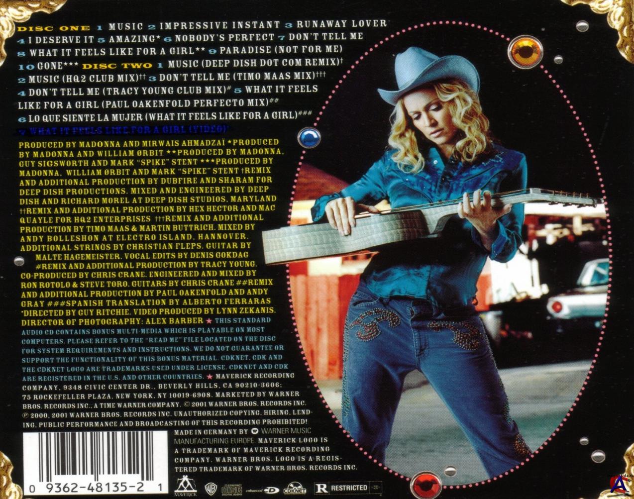 Трэклист CD1 1-01 Music 3:45 1-02 Impressive Instant 3:37 1-03 Runaway Lover 4:47 1-04 I Deserve It 4:23 1-05 Amazing 3:43 1-06 Nobody"s Perfect 4:58 1-07 Don"t Tell Me 4:40 1-08 What It Feels Like For A Girl 4:43 1-09 Paradise (Not For Me) 6:33 1-10 Gone 3:25 CD2 2-01 Music (Deep Dish Dot Com Remix) Remix – Deep Dish 11:22 2-02 Music (HQ2 Club Mix) Remix – HQ2 8:50 2-03 Don"t Tell Me (Timo Maas Mix) Remix – Timo Maas 6:55 2-04 Don"t Tell Me (Tracy Young Club Mix) Remix – Tracy Young 11:00 2-05 What It Feels Like For A Girl (Paul Oakenfold Perfecto Mix) Remix – Paul Oakenfold 7:19 2-06 Lo Que Siente La Mujer (What It Feels Like For A Girl) 4:45
