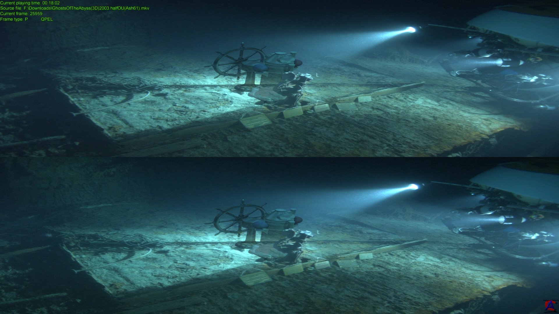 Качество: BDrip 1080р Видео кодек: AVC / 23,976 fps / 1920х1080p / 16.3 Mbps Аудио кодек: #1 - Русский / AC3 / 48 KHz / 5.1 ch / 448 Kbps (DVO - Редакция BlueBird) #2 - Английский / AC3 / 48 KHz / 5.1 ch / 640 Kbps (Original) Жанр: документальный, семейный Перевод: Профессиональный (двухголосый закадровый) Премьера в мире: 31 марта 2003, Рейтинг mpaa: PG - Рекомендуется присутствие родителей Продолжительность: 01:00:44 Метод просмотра: Смотреть на 3D TV или Stereoscopic Player и анаглиф очки Формат 3d: Anamorph OverUnder Информация о фильме: Джеймс Кэмерон расcказывает подлинную историю легендарного «Титаника». Подготовка к уникальным подводным съемкам велась долгих три года, за которые были собраны новейшие технологические ресурсы и составлена команда высококлассных профессионалов, в которую помимо съемочной группы вошли известные историки и океанологи.