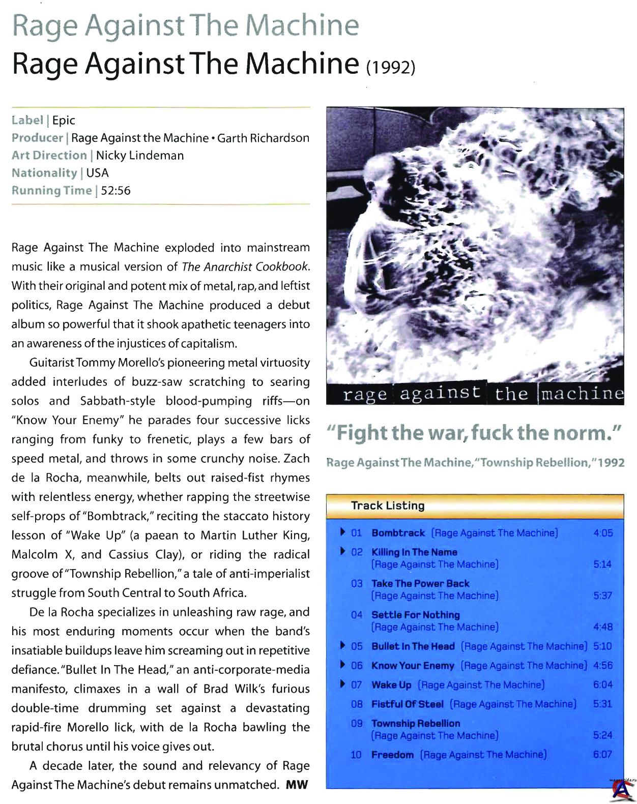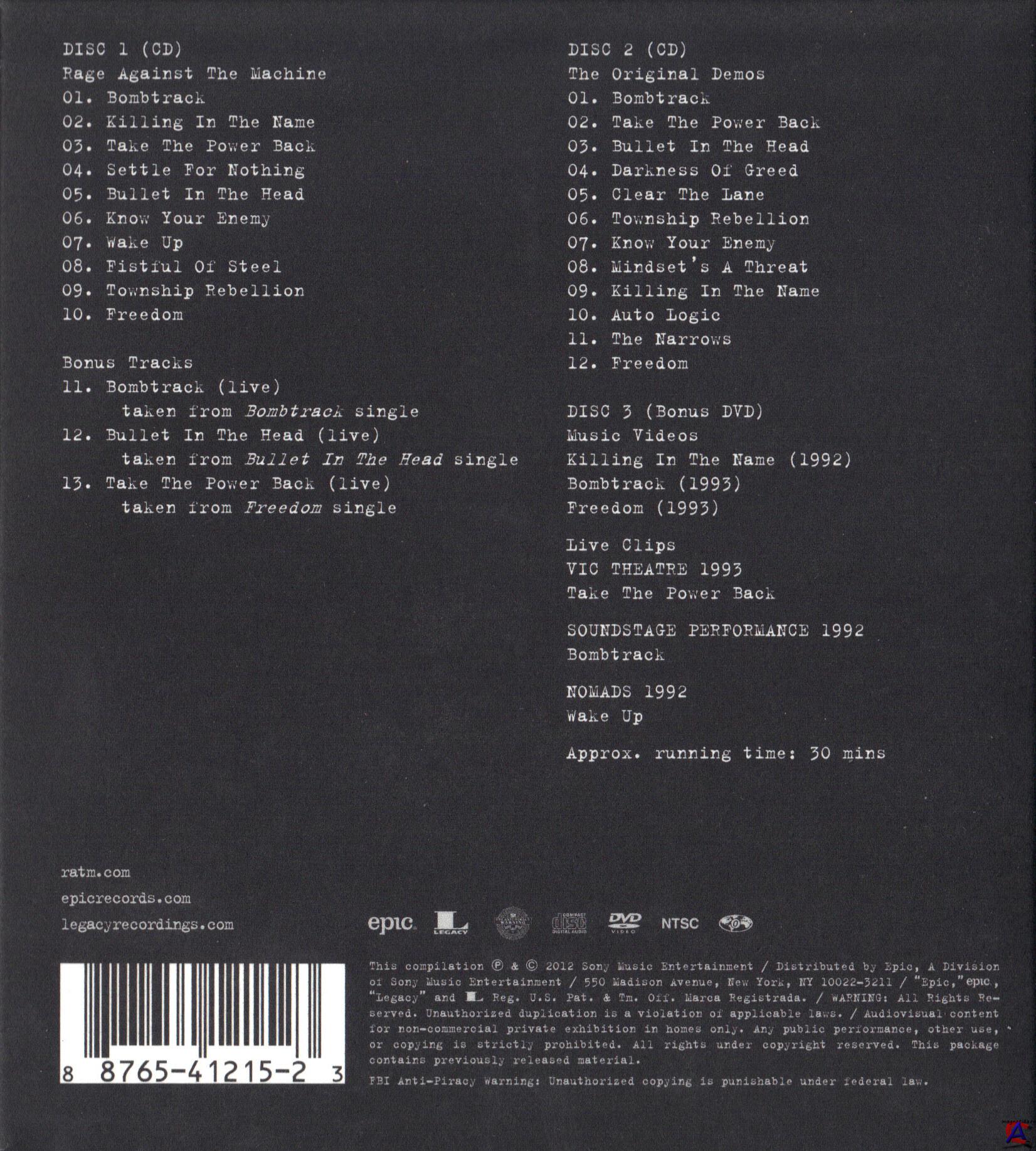 Трэклист CD1 Rage Against The Machine 01 Bombtrack 4:04 02 Killing In The Name 5:14 03 Take The Power Back 5:37 04 Settle For Nothing 4:48 05 Bullet In The Head 5:09 06 Know Your Enemy 4:55 07 Wake Up 6:04 08 Fistful Of Steel 5:31 09 Township Rebellion 5:24 10 Freedom 6:06 Bonus Tracks 11 Bombtrack (Live) 5:53 12 Bullet In The Head (Live) 5:44 13 Take The Power Back (Live) 6:14 CD2 The Original Demos 01 Bombtrack 4:05 02 Take The Power Back 5:40 03 Bullet In The Head 5:09 04 Darkness Of Greed 3:40 05 Clear The Lane 3:48 06 Township Rebellion 4:19 07 Know Your Enemy 3:56 08 Mindset"s A Threat 6:28 09 Killing In The Name 4:07 10 Auto Logic 4:35 11 The Narrows 5:40 12 Freedom 5:41