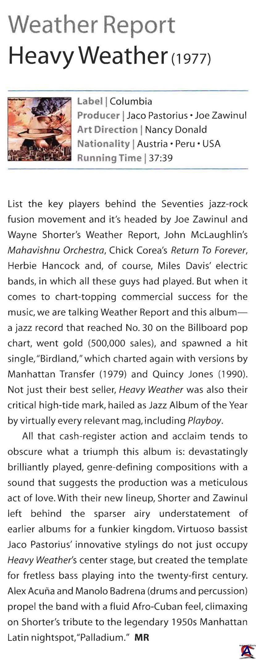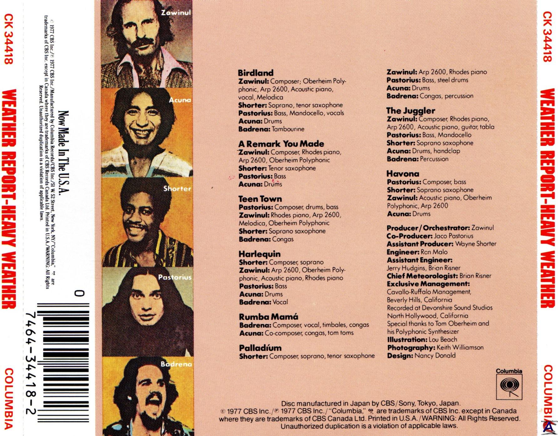 Подробнее Альбом начинается с композиции " Birdland", ставшей с тех пор уже классикой джаза. Композиция имела огромный коммерческий успех, необычный для инструментальной музыки. Отличительной чертой " Birdland" стала игра Пасториусом гармониями на басу. Существует концертная запись этой вещи до прихода в группу Пасториуса, и там эту тему исполняют только клавиши. Среди самых завзятых поклонников Weather Report модно не называть Heavy Weather самым любимым альбомом. Даже сам Джозеф Завинул говорил: " Heavy Weather — хорошая пластинка, но есть другие, которые мне нравятся больше. Например, Black Market, Night Passage. Мне нравятся все, но некоторые — особенно." И тем не менее, факты говорят сами за себя: альбом Heavy Weather пользовался наибольшим успехом как у публики, так и у критиков. Ни один другой альбом Weather Report не получил столько наград, как Heavy Weather. В 1977 году он был назван "альбомом года" практически каждым изданием, которое выдает такие награды. В ежегодном опросе читателей журнала Down Beat Heavy Weather победил тогдашнего лидера — альбом Херби Хэнкока V.S.O.P. соотношением голосов 844 к 196. Даже обложка альбома, в исполнении Лоу Бича, номинировалась на премию Grammy. Heavy Weather — единственный альбом Weather Report единодушно включенный многими критиками в книгу 1001 альбом, которые надо послушать, прежде чем умрешь. Heavy Weather был также самый продаваемый альбом Weather Report, он быстро разошелся тиражом в полмиллиона экземпляров, став золотым. Heavy Weather достиг 3-го места в Топ 200 альбомов Биллборда и был №1 в его джазовом списке. Главной причиной коммерческого успеха альбома была композиция " Birdland". Это единственный хитовый сингл Weather Report, расширивший их аудиторию за счет любителей рок и поп музыки. " Несомненно, наш следующий альбом Heavy Weather стал настоящим прорывом для нас в коммерческом смысле, " — вспоминал Завинул в 1984 году. " Альбом великолепно звучал, мы сыграли его хорошо, как мы всегда играем в студии. Мы позволили уйти Честеру Томпсону, а Акунья стал играть на барабанах. Потом мы взяли перкуссиониста Маноло Бадрену. Маноло — еще один величайший, один из гигантов перкуссии." Уроженец Пуэрто-Рико Бадрена пришел в группу в апреле 1976. До этого он играл сальсу во многих группах Нью-Йорка, его привел в группу Акунья. Кроме того, Бадрена был еще и профессиональным художником, и его фрески украшают стены университета в Сан-Хуане. Уже в процессе записи предыдущего альбома Black Market возникло расхождение между ударником Томпсоном и Джако Пасториусом. По словам Томпсона, " репетиции (Black Market) выглядели довольно странно, потому что песни, которые я записывал с Альфонсо (Джонсоном) на басу на 180 градусов отличались от тех, которые играл на басу Джако. У Альфонсо, когда он играл, было прекрасное ощущение пространства, а Джако был сплошными нотами. Это просто не срабатывало. Конечно, я мог бы как-то приспособиться к этому музыкально, но если честно, мне не хотелось." Алекс Акунья так описал эту ситуацию: " Было видно, что Джако хочет играть с барабанщиком другого стиля. Как-то раз мы собрались в мотеле Tropicana на бульваре Санта-Моника и джемовали в номере всякие мелодии, которые Уэйн Шортер написал для квинтета Майлза Дэвиса, и он был очень впечатлен, что перуанский южно-американский латинский бразтльский перкуссионист прекрасно знал и здорово играл все эти мелодии. После того, со слов Акуньи, "Джако сказал Джо, что хочет чтобы я играл в г