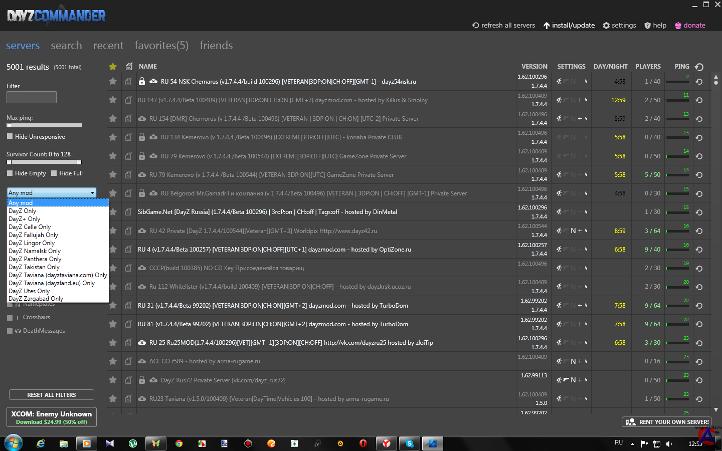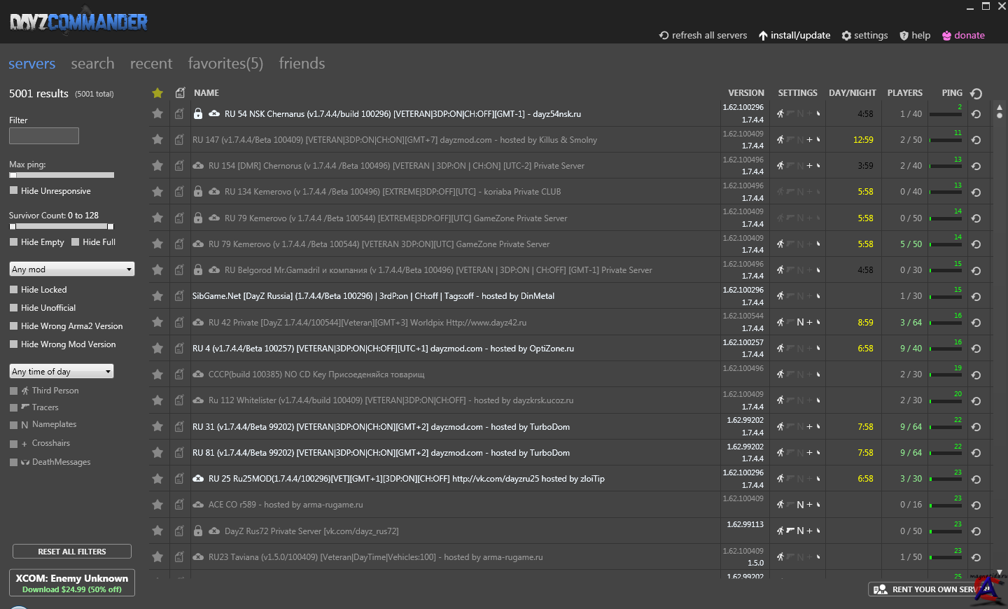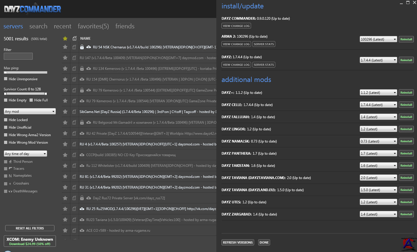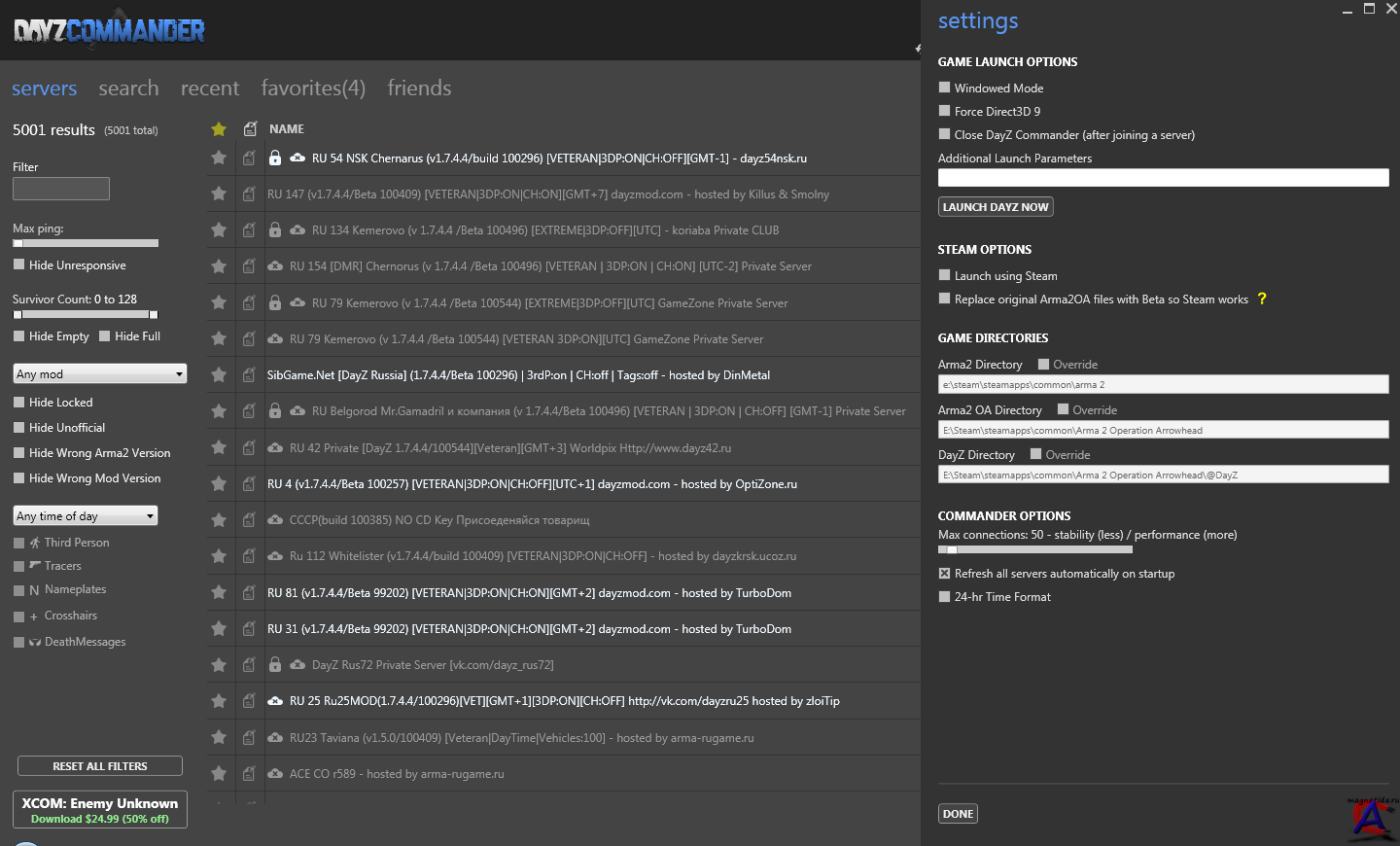 Точно подбирать сервер, используя широкий выбор фильтров (время, кол-во игроков, настройки сервера и т.д) Список друзей. Просто добавьте ник своего друга и DC сообщит вам где он играет Автоматическое обновление Arma II и мода DayZ до актуальной или старых версий Возможность добавления сервера в избранное. Сервер будет виден всегда (привет Six launcher) Сохраняет историю посещенных серверов. На сегодняшний день находит +4800 серверов по всему миру