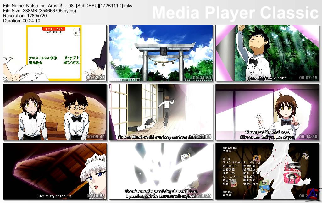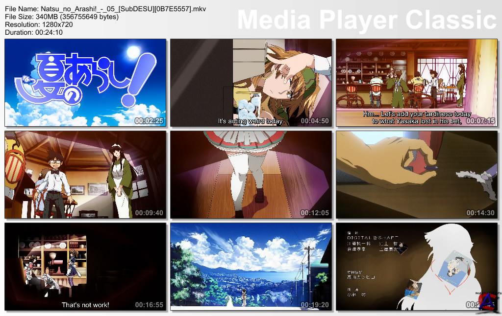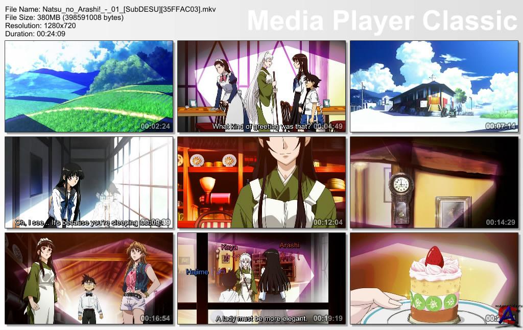 Качество: HDTV Перевод: отсутствует Видео: MPEG4 Video (H264) 1280x720 23.98fps Аудио: AAC 48000Hz stereo [Японский] Субтитры: Advanced SubStation Alpha [Английский] Продолжительность: 13 серий по 25 минут Описание: Ясака Хаджиме поехал на летние каникулы к дедушке. Зайдя в кафе по соседству он с первого взгляда влюбился в официантку. Её зовут Араши и, как выяснилось позже, она призрак, которому нужна помощь Хаджиме для путешествий в прошлое. Хаджиме решает подработать в кафе, чтобы быть поближе к Араши. Постепенно выясняется что у коллег тоже есть свои секреты. Релизы групп SubDESU и Shinji.