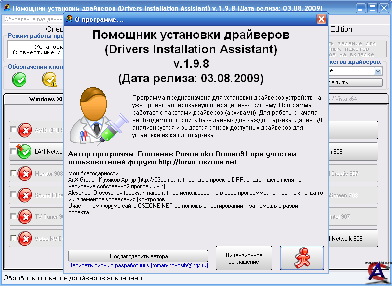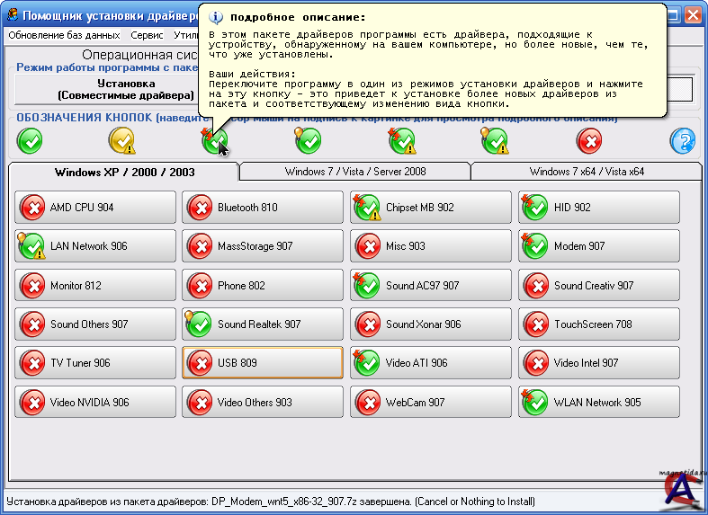 Обновлённый сборник драйверов от SamLab для ВСЕХ Windows x86/x64 с Windows 2k по Windows 7 с программой для автоопределения вашего оборудования и автоустановки нужных драйверов! В сборник включены лучшие и самые актуальные на данный момент драйвера (драйверпаки) от Bashrat Возможна установка как драйверов для отдельных устройств, так и всех сразу. Установка проходит буквально в несколько кликов. В качестве оболочки-установщика использована программа Driver Installer Assistant 1.9.8 (03.08.2009), которая самостоятельно распознает имеющееся на компьютере железо и предлагает установить драйвера. Кроме того, в сборник включена популярная российская программа для автоматической установки драйверов DriverPack Solution 9 Professional, которая позволяет найти и загрузить отсутствующий драйвер из Интернета или обновить включенные в сборку драйвера до более актуальных версий. Основные Драйвер-Паки: • AMD CPU 9.04 • Chipset MB 9.02 • LAN Network 9.03 • MassStorage 9.06 • Sound AC97 9.06 • Sound Creativ 9.06 • Sound Realtek 9.06 • Sound Others 9.06 • Sound Xonar 9.06 • TV Tuner 9.06 • Video ATI 9.06 • Video Intel 9.06 • Video NVIDIA 9.06 • Video Others 9.06 • WLAN Network 9.05 Дополнительные Драйвер-Паки: • Bluetooth 8.10 • HID 9.02 • Misc 9.03 • Modem 9.05 • Monitor 8.12 • WebCam 9.06 • Phone 8.02 • USB 8.09