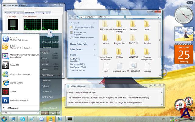 Features Seven Transformation Pack will replace many of the resources in Windows XP/Windows Server 2003. It can change such things as: * Boot screen * Welcome Screen / Logon Screen * New msstyles files (visual styles) * New desktop and file icons * New toolbar icons * Progress Dialogs * Sounds scheme * System Tray icons * New Wallpapers * Some Windows 7s popular features * And much more Changes in Version 2.0 -Added Windows Vista compatibilities (some desktop enhancements and applications) -Fixed memory leaks in Vista Rainbar launcher but wont reload on resolution changes -Fixed applications uninstallation script that doesnt remove all installed applications -Fixed My Pictures folder icon showing My Videos instead -Fixed resolution reader false positive report in Rainbar launcher -Fixed restoring superbar tweaks in uninstallation -Fixed uxtheme.dll patching routines in setup files integration mode -Fixed Windows 7 default pictures installation (wrong directory) -Updated ViGlance to version 1.0 build 1182 -Aero Peek support (Live thumbnail, progress taskbar) -Pinning application -Options -Windows 7 RTM graphics -Updated Windows 7 icons -Updated Windows 7 visual style and WindowBlinds skin -All programs group menu item -Taskbar button -Taskbar flashing button Changes in Version 1.0 (From Vista Transformation Pack 9.0.1) -Added Superbar tweaks for sleek and groupped taskbar item -Added Windows 7 new wallpaper -Added Windows 7 user pictures -Fixed scrnrdr.exe application for being reported as malware -Fixed WindowBlinds skin detection bug in Welcome Center -Removed LClock as it doesnt fit new taskbar UI anymore -Removed Styler toolbar as it becomes obsolete with ViSplore -Removed VisualTooltip due to its glitches caused with the system -Updated battery tray icon -Updated logon screen with horizontal account list. -Updated logon startup branding to Windows Seven -Updated Vista Rainbars default background to transparent (without border) -Updated theming engine to apply themes and automatically -Updated system to load/save configuration for Personalization -Updated Transformation Destination information context for better understanding -Updated TrueTransparency to version 1 with SevenStyle skin -Updated user accounts optimization settings -Updated ViSplore with Windows Seven skin -Updated ViStart to version 2.0 build 3468 (Native mode) with Windows Seven skin -Updated visual styles to Windows 7 ones called "Windows Seven" -Updated ViOrb to ViGlance (Superbar emulation) -Updated Windows 7 icons -Updated ViSplore and WinFlip to be safe applications Рекомендую установку Window Blinds перед установкой STP чтобы был эффект Aero Glass в теме.