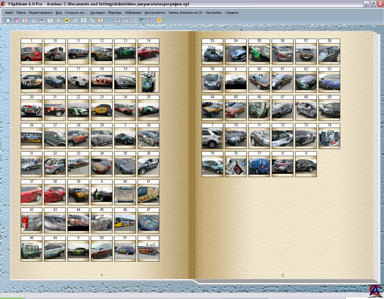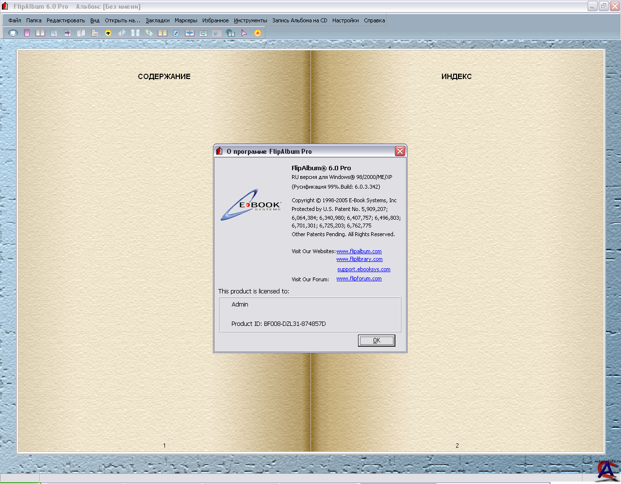 Тип издания: лицензия Язык интерфейса: английский + русский Платформа: Win 98/2000/ME/XP Системные требования: Минимальные Системные Требования: Windows® 98/2000/ME/XP IBM® PC совместимый, Pentium® II 300 MHz 128 MB RAM 100 MB свободного пространства на диске 16-bit видеокарту 800x600 - разрешение экрана Рекомендуемые Системные Требования: Windows® 98/2000/ME/XP IBM® PC совместимый, Pentium® III или 4 процессор, или аналогичный 256MB RAM Для просмотра и совместного использования фотоальбомов в Сети необходимы, как минимум Internet Explorer 5.01 или выше и соединение с Internet . Для создания Video CDs, Super Video CDs или DVDs для воспроизведения DVD, программа записывающая CD/DVD должна поддерживать форматы Video CD, Super VCD и DVD. Описание: FlipAlbum CD - альбом на CD с реалистично перелистывающимися страницами. FlipAlbum CD показывает изображения так, как они выглядят в настоящем альбоме, позволяя рассматривать их и переворачивать страницы, словно это настоящая книга. Если FlipAlbum CD был создан как мульти-альбомный, то альбомы будут представлены для выбора в форме книжной полки. Это самый наглядный способ просмотра вашей коллекции фотографий.Кроме всего этого, встроенный в FlipAlbum графический редактор позволяет подкорректировать фотографии.. Доп. информация: Читать файл (readme) К программе прилагаются дополнительные обложки и скины для альбомов. P.S.: Программу не проверял (не записывал на DVD), но на скриншотах можете посмотреть, что из себя она представляет.