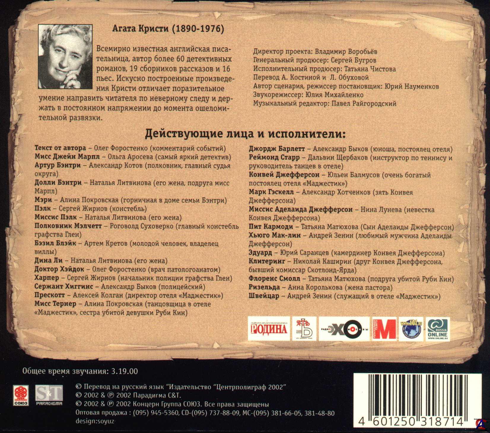 Качество: Битрейт: 176-180 кбит, 44kHz. Общее время звучания: 3.19.00 Действующие лица и исполнители: Текст от автора (комментарий событий) - Олег Форостенко Мисс Джейн Марпл (самый яркий детектив) - Ольга Аросева Артур Бэнтри (полковник, главный судья округа) - Александр Котов Долли Бэнтри (его жена, подруга мисс Марпл) - Наталья Литвинова Мэри (горничная в доме семьи Бэнтри) - Алина Покровская Пэлк (констебль) - Сергей Жирнов Миссис Пэлк (его жена) - Наталья Литвинова Полковник Мэлчетт (главный констебль графства Глен) - Роговолд Суховерко Бэзил Блэйк (молодой человек, владелец виллы) - Артем Кретов Дина Ли (его жена) - Наталья Литвинова Доктор Хэйдок (врач патологоанатом) - Олег Форостенко Харпер (начальник полиции графства Глен) - Сергей Жирнов Сержант Хиггинс (полицейский) - Александр Быков Прескотт (директор отеля `Маджестик`) - Алексей Колган Мисс Тернер (танцовщица в отеле `Маджестик`, сестра убитой девушки Руби Кин) - Алина Покровская Джордж Барлетт (юноша, постоялец отеля) - Александр Быков Реймонд Старр (инструктор по теннису и руководитель танцев в отеле) - Дальвин Щербаков Конвей Джефферсон (очень богатый постоялец отеля `Маджестик`) - Юльен Балмусов Марк Гэскелл (зять Конвея Джефферсона) - Александр Хотченков Миссис Аделаида Джефферсон (невестка Конвея Джефферсона) - Нина Лунева Пит Кармоди (cын Аделаиды Джефферсон) - Татьяна Матюхова Хьюго Мак-лин (любимый мужчина Аделаиды Джефферсон) - Андрей Зенин Эдуард (камердинер Конвея Джефферсона) - Юрий Саранцев Клитеринг (друг Конвея Джефферсона, бывший комиссар Скотлонд-Ярда) - Николай Каширин Флоренс Смолл (подруга убитой Руби Кин) - Татьяна Матюхова Ризельда (жена пастора) - Анна Королькова Швейцар (служащий в отеле `Маджестик`) - Андрей Зенин От издателя: Всемирно известная английская писательница, автор более 60 детективных романов, 19 сборников рассказов и 16 пьес. Искусно построенные произведения Кристи отличает поразительное умение направить читателя по неверному следу и держать в постоянном напряжении до момента ошеломительной развязки.