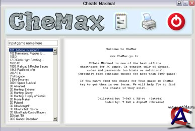 CHEats MAXimal - наибольшая из известных мне на данный момент программ, которые являют собой базу данных с кодами для игр. Простой и красивый интерфейс, малый размер, и при этом огромное количество представленных игр. Особенностью базы является отсутствие в ней хинтов и прочей “отсебятины“, вашему вниманию представлены только коды (cheats, hex-cheats) и пароли (passwords ). В нашей базе представлены коды к играм, которые были выпущены за последние 10 лет, она являет собой плод шестилетней кропотливой работы.