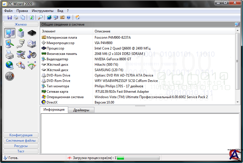 PC Wizard 2009 Тип распространения: бесплатно Версия: 1.9 Язык: Русский Веб сайт: www.cpuid.com/pcwizard.php Программа для тестирования ПК и предоставления различной информации о компонентах компьютера. PC Wizard поддерживает большое число современных процессоров, материнских плат, жёстких дисков и других комплектующих. PC Wizard позволяет анализировать такие компоненты компьютера, как производительность процессора, оперативной памяти, жесткого диска, оптических приводов, флэш-накопителей и т.д. Программа предоставляет подробную информацию о драйверах, Twain и WIA-устройствах, модемах, звуковых картах, сети и т.д., а также позволяет просканировать порты. В программу встроен модуль обновления