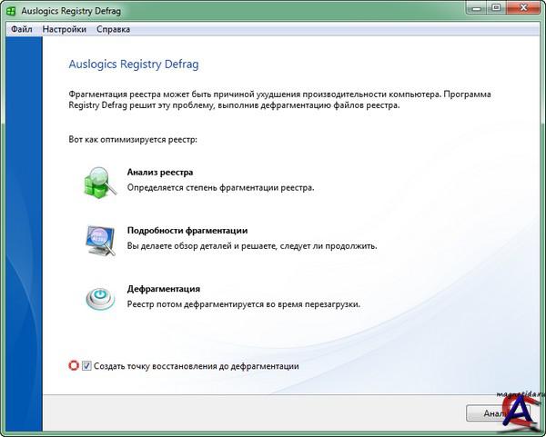 Версия программы: 6.5.1.0 Язык интерфейса: ML-RU ОС: Windows 8/7/2008/Vista/2003/XP (32-bit & 64-bit). Лекарство: Бесплатна для частного использования. Auslogics Registry Defrag – качественная утилита для дефрагментации реестра операционной системы. Auslogics Registry Defrag поможет ускорить работу Windows благодаря дефрагментации реестра, оптимизации размещения информации в нем, а также за счет исправления ошибок, накапливающихся в реестре в процессе его долгой эксплуатации. ОС Windows осуществляет сотни обращений в секунду для чтения и записи данных в реестре и его медленная работа - одна из важнейших причин замедления работы всей системы в целом. Auslogics Registry Defrag проведет анализ реестра, чтобы выяснить, следует ли делать дефрагментацию и какие результаты получатся. После завершения анализа и работы, Auslogics Registry Defrag подготавливает подробный и понятный отчет с результатами своей работы. Реестр - сложная и важная часть системы. Программы на вашем компьютере обращаются к реестру сотни раз в секунду. Это означает, что реестр, как и диски, может служить причиной существенного замедления работы системы. Многие из нас знают, что фрагментация реестра приводит к замедлению работы системы. Но многие будут удивлены, когда узнают, что реестр весь грузится в память, когда компьютер работает. Памяти никогда не бывает слишком много и поэтому чем меньше файл реестра, тем меньше он займет памяти, тем больше ее останется для других нужд, а также тем быстрее будет система работать с этими данными. Загрузите Auslogics Registry Defrag, чтобы дефрагментировать и сжать ваш реестр. Программа проверит реестр на наличие ненужных данных, испорченных ключей и создаст копию реестра, которая будет меньше и не будет содержать ненужных данных.