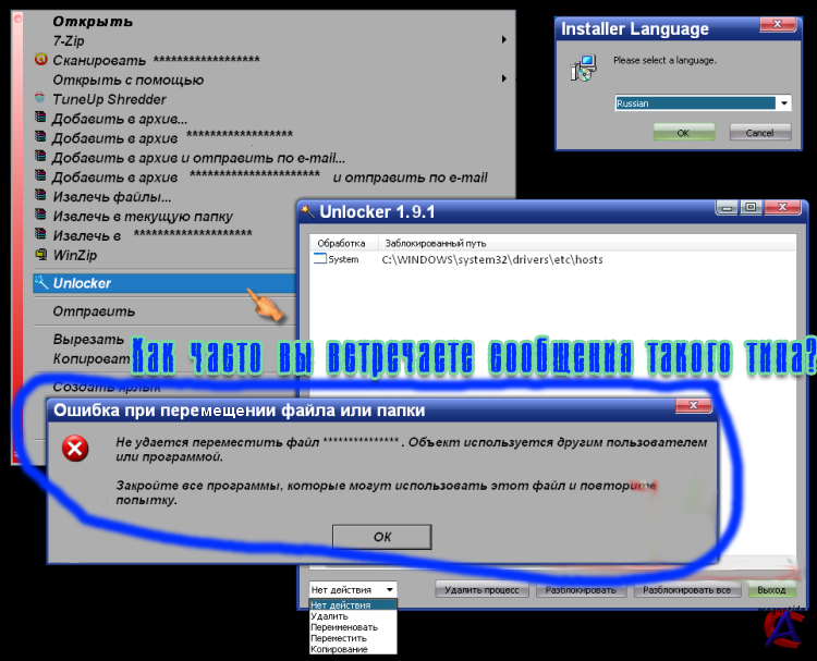 О программе Unlocker 1.9.1 Программа Unlocker разработана Cedrick Collomb как утилита, которая позволяет разблокировать практически любой файл в операционной системе, который в данный момент используется другим процессом. Программа Unlocker распространяется абсолютно бесплатно и ее можно использовать даже в коммерческих целях. Суть программы в том что, утилита монтирует в контекстное меню операционной системы Windows пункт «Unlocker». При необходимости удалить, переместить или переименовать какой либо заблокированный системным процессом файл, необходимо кликнуть по пункту «Unlocker». И если удаление, перемещение или переименование не возможно простым путем, утилита выдаст информацию о тех процессах, которые блокируют этот файл, а также предложит варианты решения этой проблемы (остановить все процессы, использующие этот файл, освободить этот файл от используемых процессов или выдать полную информацию о блокирующих процессах). Программа переведена на множество языков мира, в том числе и русский язык, что позволяет работать с утилитой более удобней и комфортней.