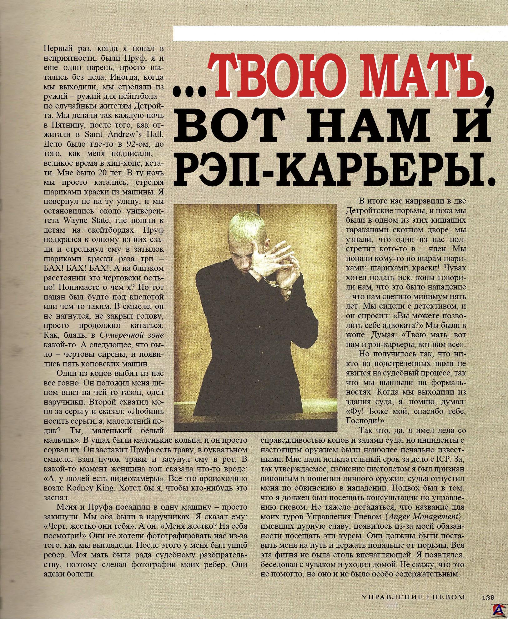 Год выпуска: 2008 Язык: РУССКИЙ Автор: Eminem (Marshal Mathers III) Жанр: Autobiography, Rap Качество: Отсканированные страницы Количество страниц: 220 Описание: Книга под названием «Way I Am» - это собрание историй из личной жизни Маршалла, размышления, фотографии, оригинальные рисунки, а также ни разу до этого не публиковавшиеся тексты песен. Первый тираж книги предусматривает также наличие DVD с видеоматериалами и неопубликованными интервью. А больше всего мне понравились обложка и тексты песен на отдельных листах. Обложка, поверх обычного переплета выполнена из красной ацетатной пленки (напоминает обложку CD диска Jay-Z под названием «Kingdom Come»). Под красной обложкой скрываются написанные Эминемом стихи, а под ними – фотографии…их действительно стоит увидеть. Также в конце книги есть несколько перфорированных страниц, которые раскладываются. Эти листы воспроизводят стихи Эминема к таким песням, как «Stan» и «Lose Yourself». Я долго боролся за то, чтобы книга содержала отрывные листы, потому что есть что-то особенное в том, чтобы держать в руке оригинальные тексты Эминема, вертеть их, пытаясь разглядеть не совсем разборчиво написанные слова. (Каким-то же образом он читает с этих страниц). Повторюсь, следует увидеть эти листы, чтобы понять, о чем я говорю. (c)