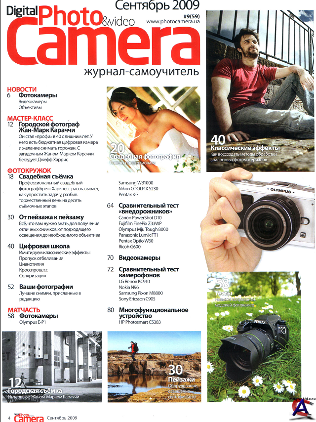 Digital Photo & Video Camera №9 (сентябрь 2009) Формат: .PDF Язык: русский. Содержание: НОВОСТИ Фотокамеры Видеокамеры Объективы МАСТЕР-КЛАСС Городской фотограф Жан-Марк Караччи Он стал «профи» в 40 с лишним лет. У него есть бюджетная цифровая камера и желание снимать горожан. С загадочным Жаном-Марком Караччи беседует Джефф Харрис ФОТО КРУЖОК Свадебная съёмка Профессиональный свадебный фотограф Бретт Харкнесс рассказывает, как упростить задачу, разбив торжественный день на десять съёмочных этапов От пейзажа к пейзажу Всё, что вам нужно знать для получения отличных снимков: от подходящего освещения до необходимого объектива Цифровая школа Имитируем классические эффекты: Пропуск отбеливания Цианотипия Кросспроцесс Соляризация Ваши фотографии Лучшие снимки, присланные в редакцию МАТЧАСТЬ Фотокамеры Olympus Е-Р1 Samsung WB1000 Nikon COOLPIXS230 Pentax K-7 Сравнительный тест «внедорожников» Canon PowerShot D10 Fujifilm FinePixZ33WP Olympus Mju Tough 8000 Panasonic Lumix FT1 Pentax Optio W60 Ricoh G600 Видеокамеры Сравнительный тест камерофонов LG RenoirKC910 Nokia N96 Samsung Pixon M8800 Sony Ericsson C905 Многофункциональное устройство HP PhotosmartC5383
