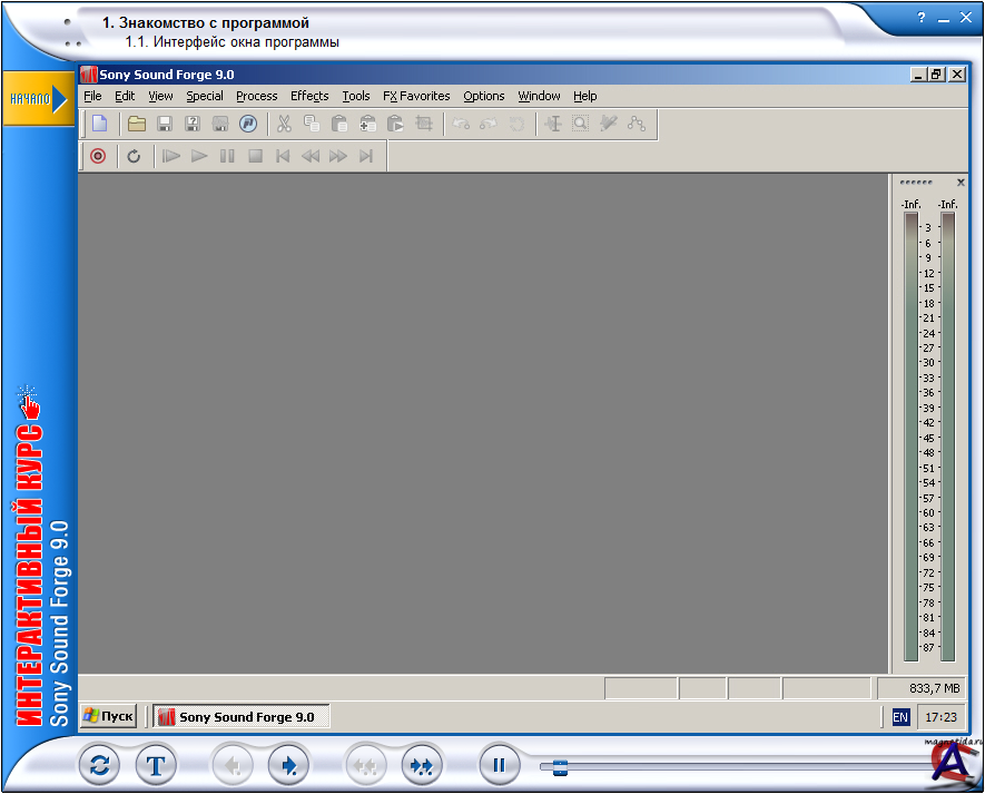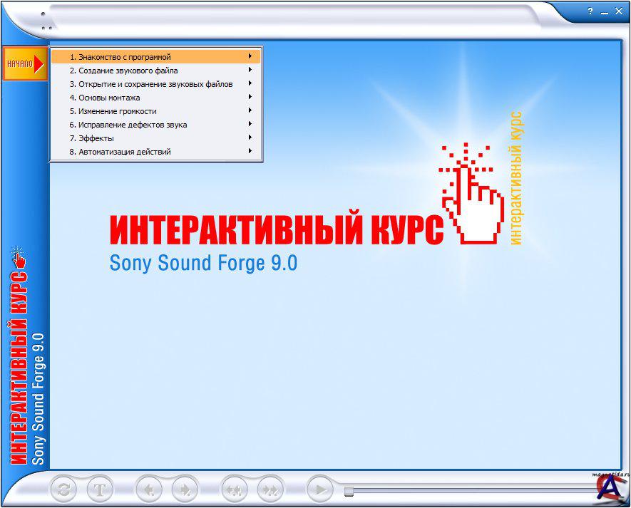 Разработчик: Новая школа Выпущено: Новый Диск Серия: Интерактивный курс Язык: Русский Минимальные системные требования: Операционная система: Windows 98/ME/2000/XP Процессор: Pentium 166 MГц Память: 64 МБ Видеокарта: 2 МБ, 1024x768 Аудиокарта: Совместимая с Windows Свободное место на ЖД: 123 МБ CD-привод: 4x О программе: Интерактивный курс по программе SoundForge 9 предназначен для пользователей, впервые приступающих к работе с этой программой. Благодаря данному курсу пользователь сможет легко и быстро освоить принципы работы с программой, подробно изучить ее интерфейс и основные действия. Особенности программы: * Самостоятельное выполнение действий с изучаемой программой непосредственно в процессе обучения. * Удобная навигация по интерактивным темам: перемещение вперед и назад по текущей теме, переход по следующим и предыдущим темам. * Текстовый вариант курса, сопровождающийся иллюстрациями. * Быстрый поиск по текущему тексту темы. * Расширенный поиск по всему текстовому содержанию курса. * Возможность перехода к интерактивному уроку, содержащему искомое слово. * Вывод на печать текстового варианта темы с предпечатным просмотром.
