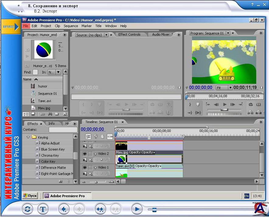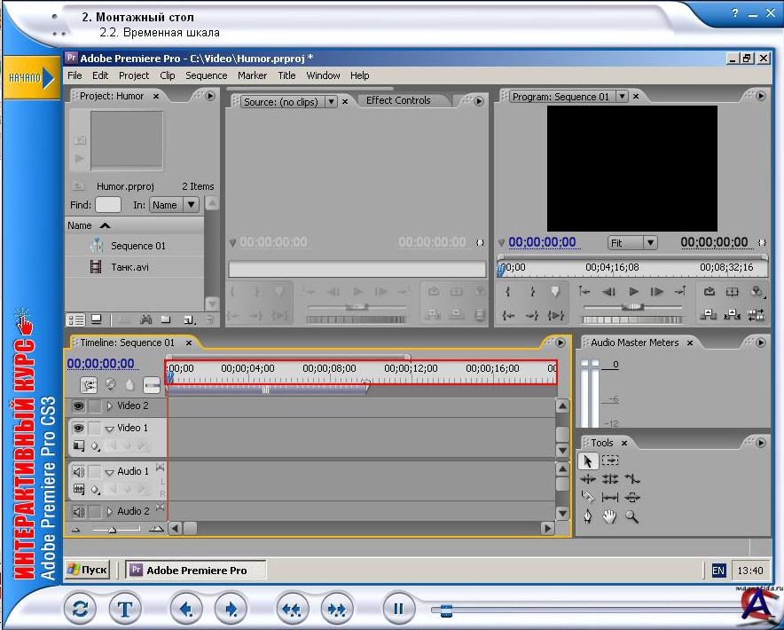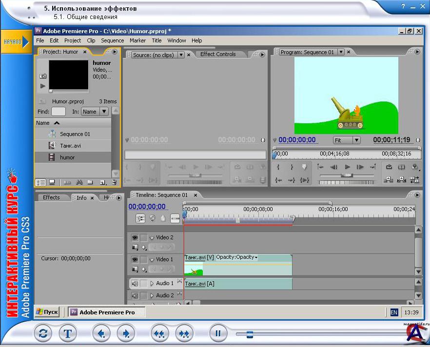 Разработчик: Новая школа Выпущено: Новый Диск Серия: Интерактивный курс Язык: Русский Минимальные системные требования: Операционная система: Windows XP/Vista Процессор: Pentium III 500 MГц Память: 128 МБ Видеокарта: 16 бит, 1024x768 Аудиокарта: Совместимая с Windows Свободное место на ЖД: 272 МБ CD-привод: 16x О программе: Эта программа послужит прекрасным помощником при изучении основ работы с популярным видеоредактором Adobe Premiere Pro CS3. С помощью данного курса вы познакомитесь с интерфейсом программы, с основами монтажа видеофрагментов, наложения и анимации эффектов, научитесь пользоваться необходимыми инструментами и создавать титры. Кроме того, вы узнаете, как работать с файлами и последовательностями, как пользоваться цветовым ключом и экспортировать результаты работы в различные форматы. Курс будет полезен и начинающим пользователям, и профессиональным видеорежиссерам, желающим изучить основы работы с программой Adobe Premiere Pro CS3. Особенности программы: * Анимированные уроки, озвученные профессиональным диктором. * Возможность выполнения действий с программой в процессе обучения. * Полная имитация интерфейса изучаемой программы. * Текстовый вариант курса с иллюстрациями. * Печать текста. * Удобная навигация по интерактивным материалам. * Поиск по тексту.