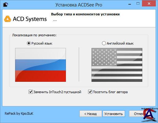 Особенности RePack by KpoJIuK: Особенности версии: Тип: установка (автоматическое определение x86/x64) Языки: английский, русский (от Loginvovchyk, с некоторыми правками) Лечение: проведено (crack-zAlAn711) Вырезано: справка Ключи командной строки: Тихая установка русской версии: /S /RU Тихая установка английской версии: /S /EN Тихая установка русской версии без InTouch2: /S /RW Тихая установка английской версии без InTouch2: /S /EW Выбор места установки: /D=ПУТЬ Ключ /D=ПУТЬ следует указывать самым последним Например: ACDSee.Pro.v6.2.212.exe /S /RU /D=C:MyProgram ОС: Microsoft Windows XP with Service Pack 2, Windows Vista, Windows 7, Windows 8