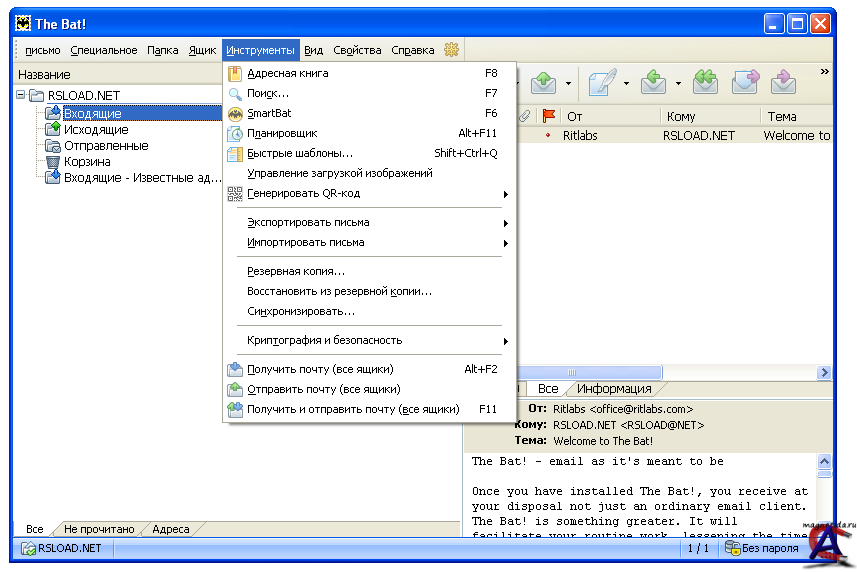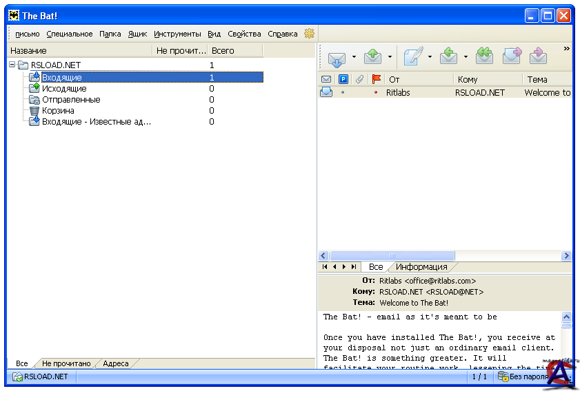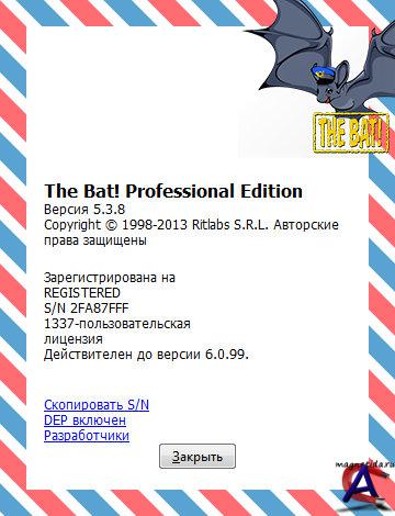 Версия программы: 5.3.8 Язык интерфейса: ML-RU ОС: Windows NT 4.0 с Service Pack 6a и Internet Explorer 5.0, Windows 2000 с Service Pack 4, Windows XP, Windows Server 2003, Windows Vista, Windows 7 (32-bit / 64-bit). Лекарство: в комплекте The Bat! – общепризнанная система обработки электронных сообщений, которая прекрасно совмещает в себе все качества, необходимые опытному пользователю. Интуитивный интерфейс позволяет пользователям The Bat! приступить к работе сразу после установки. Эффективный механизм фильтрации и сортировки помогает обрабатывать огромные потоки входящей почты, с которыми не справляются другие программы. Системные администраторы по достоинству оценят возможность установки в пакетном режиме, которая позволяет лично контролировать процесс инсталляции The Bat!. Все эти функции, наряду с полностью настраиваемыми инструментами автоматической обработки, избавляют пользователей от рутинной работы.