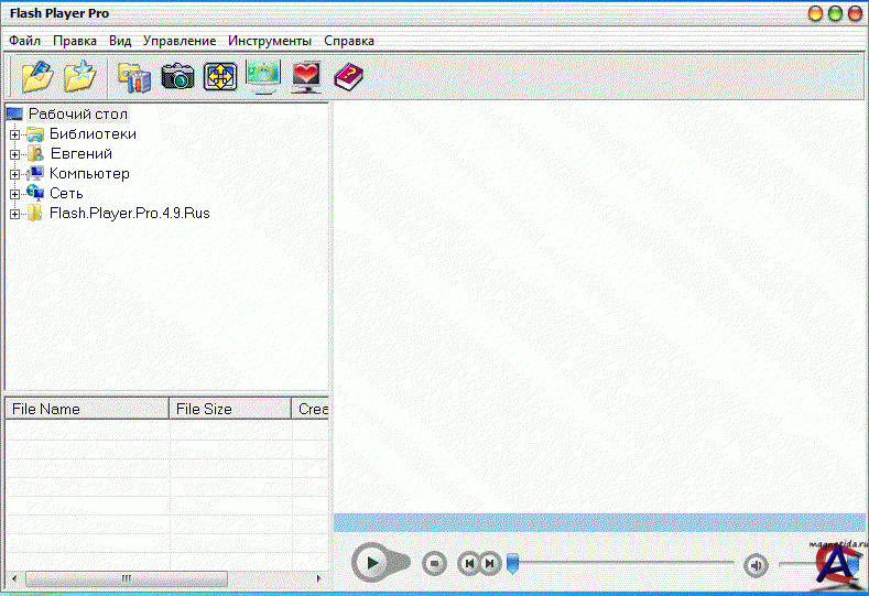 Версия программы: 5.5 Операционная система: Windows© 98, SE, ME, NT, 2000, XP, 2003, Vista, 7 and 8. Язык интерфейса: Англиский + русификатор Лекарство: Присутствует Flash Player Pro - усовершенствованный проигрыватель flash анимации. Помимо просмотра, позволяет сохранять ролики на жесткий диск, делать скриншоты и ставить результат в качестве обоев на десктоп. Плюс ко всему, конвертирует swf и exe между собой.