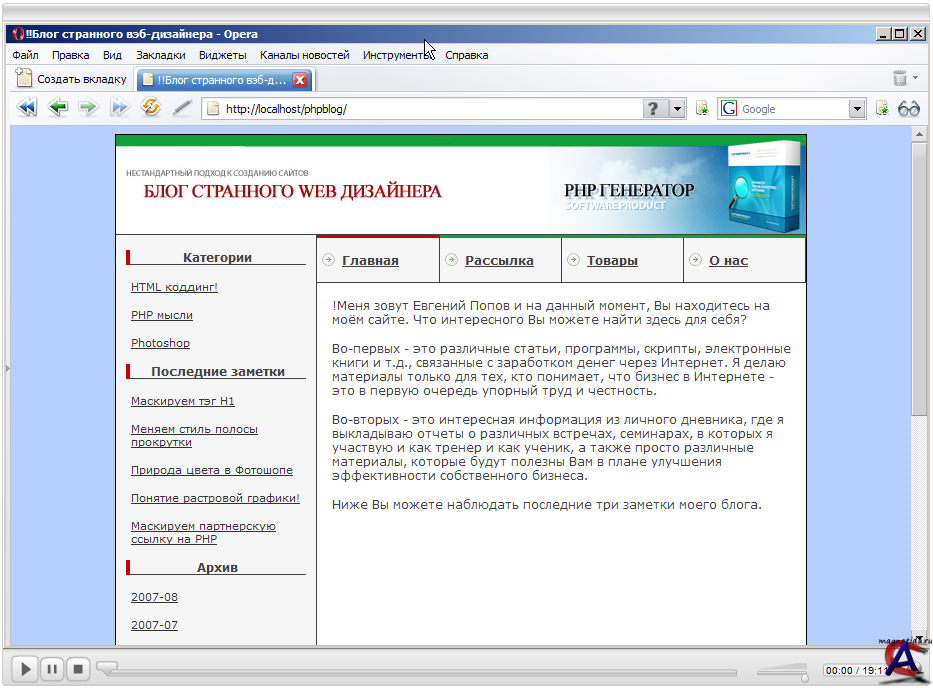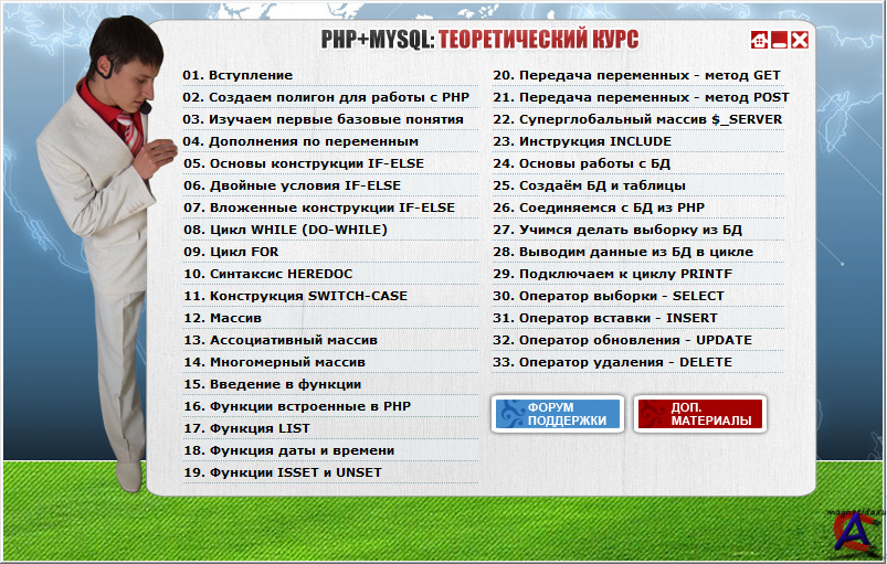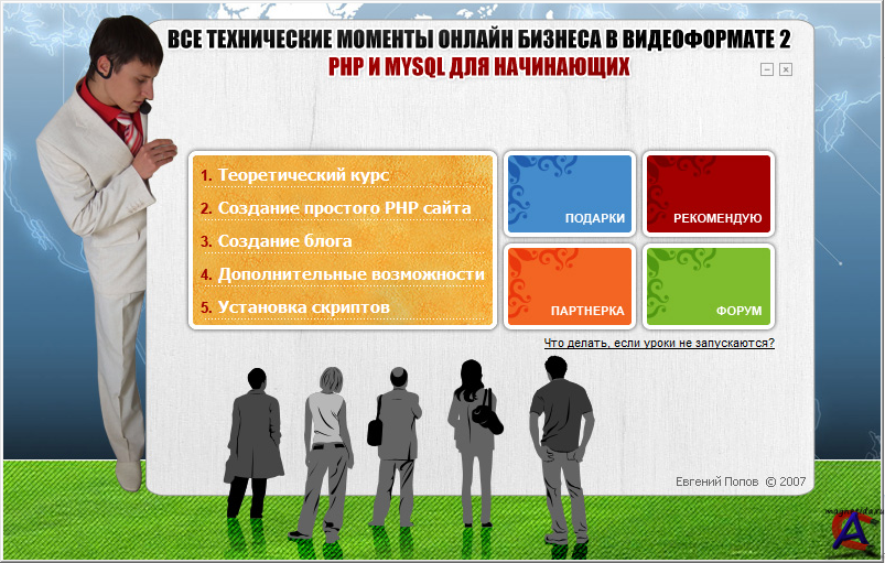Качество: DVD-rip Формат диска: iso Сложность: Для начинающих. Для запуска уроков необходимо установить flash player. Этот диск является логическим продолжением первого диска и дает человеку знания, которые позволят ему создавать динамические сайты со своей панелью управления и множеством интересных возможностей. Вся информация такого сайта хранится в базе данных, что существенно повышает удобство работы с ним и дает больше возможностей к расширению функциональности. Курс рассчитан на тех, кто уже знаком с языком HTML, знает, что такое таблицы стилей CSS и умеет пользоваться локальным сервером (всё это было в первой части). Курсы, которые вошли в этот диск: 1. Видеокурс по теории PHP+MySQL сайта (33 урока - 4 часа 36 минут) 2. Видеокурс по созданию простого PHP+MySQL сайта (20 уроков - 4 часа 31 минута) 3. Видеокурс по созданию PHP+MySQL блога (37 уроков - 8 часов 32 минуты) 4. Видеокурс по дополнительным возможностям (13 уроков - 2 часа 40 минут) 5. Видеокурс по установке популярных PHP скриптов (7 уроков - 1 час 23 минуты) + 5 бонусов (более 60 мин.) Официальный сайт автора диска: www.ruseller.com