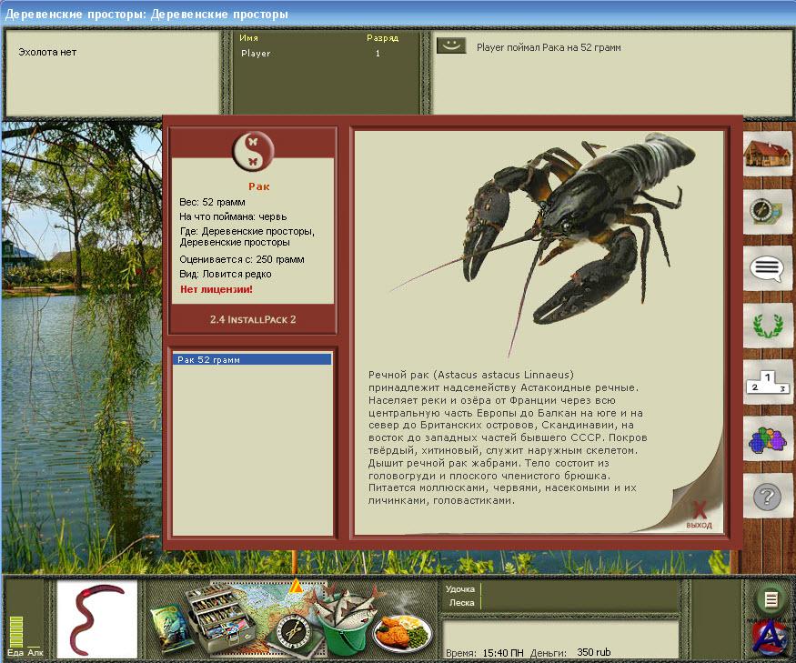 Русская Рыбалка Installsoft Edition 2.4 Год выпуска: 2009 Жанр: Симулятор Разработчик: installsoft Издательство: installsoft Платформа: PC Системные требования: МИНИМАЛЬНЫЕ СИСТЕМНЫЕ ТРЕБОВАНИЯ: Процессор: Pentium 1.2 ГГц Оперативная память: 256 мб Видеокарта с аппаратной поддержкой DirectX 9.0 Разрешение экрана: не менее 1024x768 Свободное место на жестком диске: 400 мб Microsoft Windows XP SP2, Windows Vista или Windows 7 Тип издания: лицензия Язык интерфейса: русский Сrack: Присутствует. Пароль на архив: installsoft.ru Описание: Русская Рыбалка Installsoft Edition 2.4 InstallPack 2 является на данный момент самой популярной версией игры Русская Рыбалка в интернете, имеющей десятки тысяч фанатов в России и странах ближнего зарубежья! И всё это благодаря тому, что игра претерпела огромные изменения в лучшую сторону и является абсолютно бесплатной! В игре имеется 49 самых различных рыболовных баз, 466 игровых локаций. Включены не только водоёмы СНГ, но и водоёмы всего мира. Вы сможете порыбачить на Ниле в Африке или на берегах великой Южно-Американской реки Амазонка, выйти на рыбный промысел в нейтральные воды Чёрного моря или Финского залива. Поймать полярную камбалу или чешуйчатого османа, сырдарьинского лжелопатоноса или электрического угря, амазонскую анаконду или чёрного каймана. Ни в одном из рыболовных симуляторов нет такого количества видов рыб, в этой игре их более 584. Не обделена вниманием и наживка - бокоплав и нереис, паук и гусеница, привычные нам циркулярки и колебалки противостоят мушкам и морским блёснам... И ещё очень много самых разнообразных наживок, блёсен и прикормок. Изменения коснулись и самого геймплея игры. Улучшены и отредактированы количество рыб на локациях, частота клёва, более приближены к реальности повадки рыб, любимые наживки и максимальные веса рыб. Интерфейс игры стал более красочным и удобным. Также в игру добавлены новые турниры, эликсир опыта, клады, увеличена грузоподъёмность снастей и т.д. Плюс ко всему была разработана и внедрена в игру система обычных и трофейных рыб. Благодаря этой системе, ловля рыб становится ещё более непредсказуемой и азартной. Доп. информация: НЕОБХОДИМЫЕ КОМПОНЕНТЫ ДЛЯ ЗАПУСКА ИГРЫ: 1. Microsoft DirectX 9.0c август 2009 2. Microsoft .NET Framework 2.0 3. Microsoft Visual C++ Redistributable Package