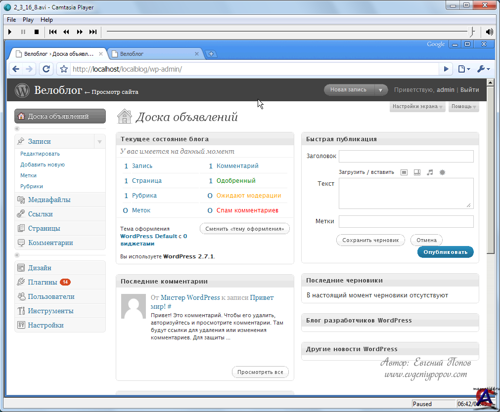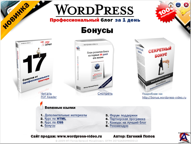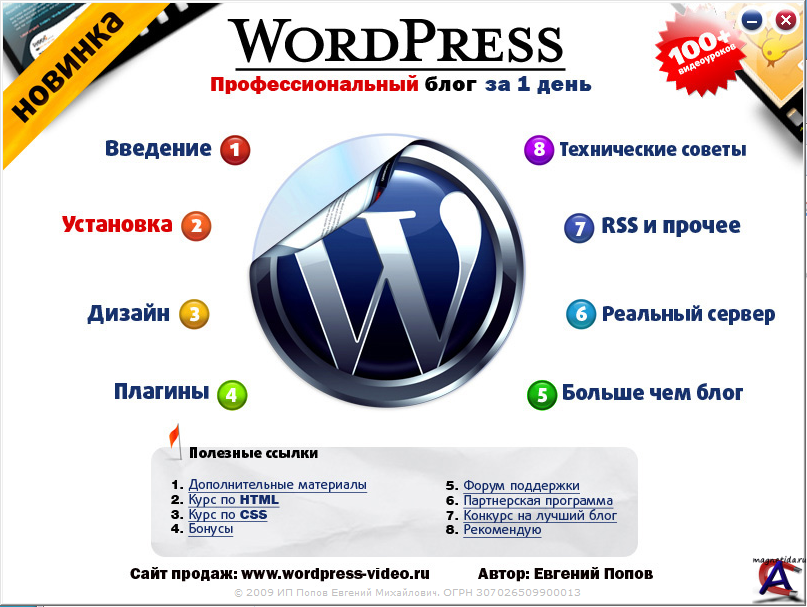 В курс вошло 109 уроков по всем аспектам ведения собственного блога на движке Wordpress.
