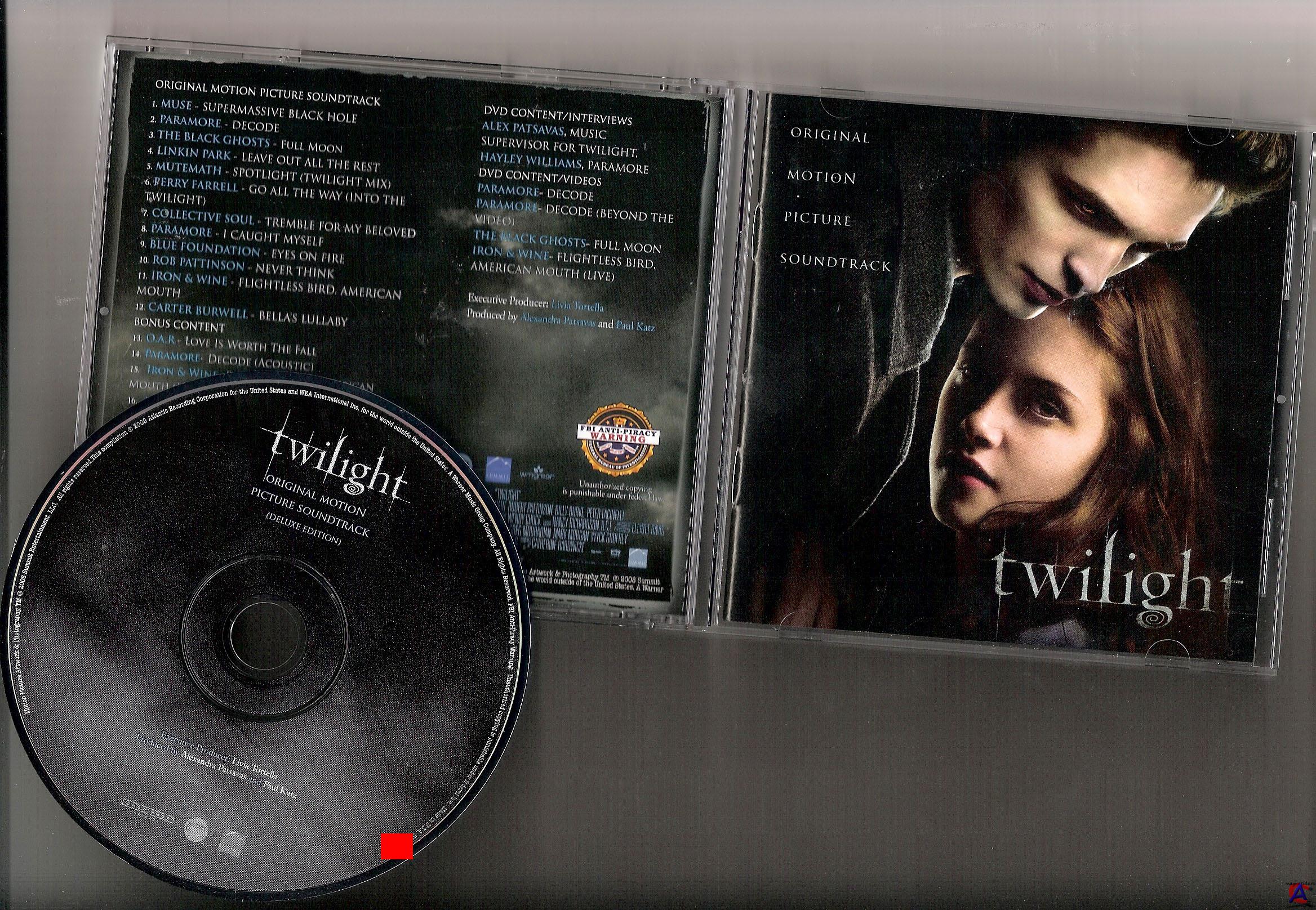 Саундтрек к фильму "Сумерки" Треклист: 1 Muse - Supermassive Black Hole 2 Paramore - Decode 3 The Black Ghosts - Full Moon 4 Linkin Park - Leave Out All The Rest 5 MuteMath - Spotlight (Twilight Mix) 6 Perry Farrell - Going All the Way (Into the Twilight) 7 Collective Soul - Tremble For My Beloved 8 Paramore - I Caught Myself 9 Blue Foundation - Eyes on Fire 10 Robert Pattinson - Never Think 11 Iron & Wine - Flightless Bird, American Mouth 12 Carter Burwell - Bellas Lullaby 13 Carter Burwell - Bellas Lullaby (Remix)