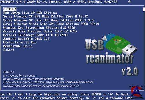Информация о софте: Название: USBreanimator Год выпуска: 2009 Платформа: 32-bit(x86) Язык интерфейса: а русский Таблетка: не требуется Размер: 1.7 GB Описание: USBreanimator v2.0 это мультизагрузочная флешка, замена загрузочному CD диску, с 4 Windows на 1 флешке. USBreanimator позволит установить с флешки Windows или загрузиться с флешки как с обычного винчестера, в меню загрузки USBreanimatora также входит много всевозможных программ и утилит. В первую очередь USBreanimator предназначен для нетбуков и компьютеров в которых отсутствует CD привод. USBreanimator работает с любого USB накопителя, даже с мобильного телефона или фотоаппарата. Сборка USBreanimatora v2.0, предназначенная для работы с USB накопителя размером от 2 ГБ и более. В меню загрузки USBreanimatora v2.0 включены: 1 RAM WinXp Live CD-USB Edition 2008 - Много полезных программ, быстро загружается, 210 Мб, поддержка сети и т. д. 2 Windows XP SP3 Blue Edition 2009 8.12.12 - Построена на оригинальном Windows XP, с обновлениями по 12.12.2008. 3 Windows XP Lite SP3 Game Edition 2008 1.0.0 - Облегчённая, полностью рабочая версия Windows XP. 4 Windows Vista Lite SP1 Game Edition 2008 32bit - Облегчённая, быстрая, нетребовательная к ресурсам ОС. 5 Windows Key Enterprise Edition 8.0 2596 - Сброс пользовательских паролей в NT-системах. 6 Acronis Disk Director Suite 10.0 (2.169) - Менеджер разделов. 7 Acronis TrueImage Home 11.0 (8.059) - Резервное копирования информации. 8 Samboot Bootable Disk 1.2 - Загрузочная дискета, русский язык, поддержка NTFS, Volkov Commander и т. д. 9 Victoria v3.51 Rus - Тестирование HDD на предмет ошибок. 10 Memtest86+ v2.11 - Программа для тестирования памяти. Все ОС предназначены для чистой установки с нуля. Все ОС предназначены для чистой установки с нуля. ИНСТРУКЦИЮ ПО УСТАНОВКЕ ЧИТАЙТЕ В: Инструкция по установке.txt