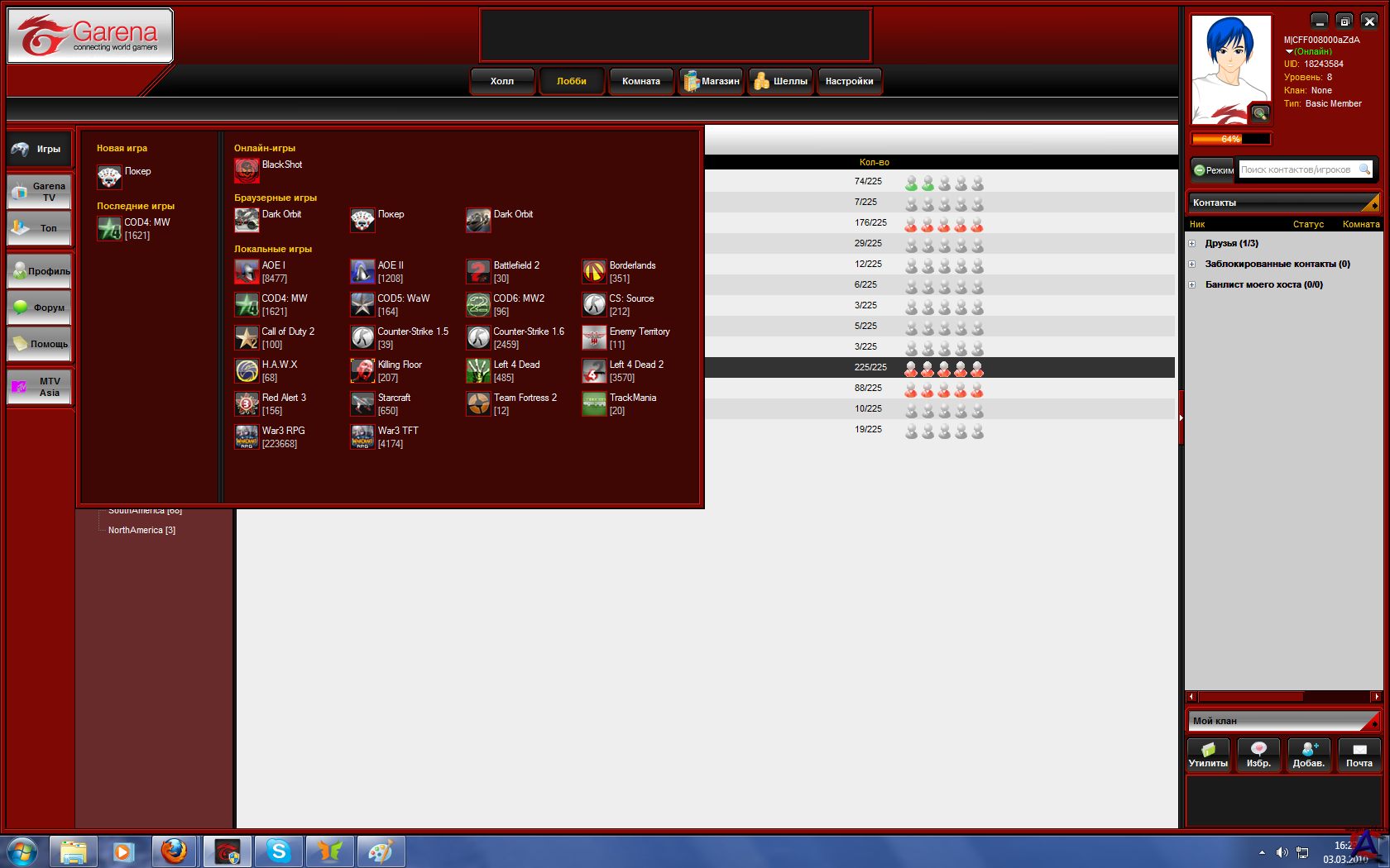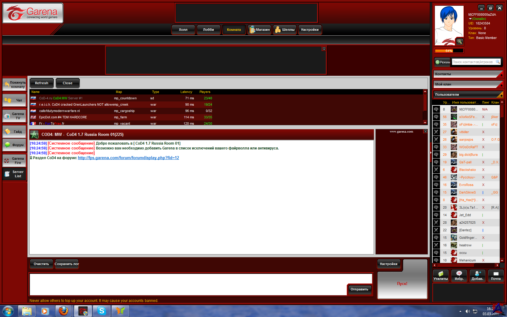 Версия: 3.34 Активация: Не требуется, но играть только через интернет Язык интерфейса: Русский Описание: Гарена - платформа для игр через интернет и мгновенного обмена сообщениями, похожа на Xfire. Распространяется на основе принципа «Free 2 Play», что позволяет не тратить на неё деньги либо тратить деньги на микроплатежи, оплачивая дополнительные возможности. Основной аудиторией являются игроки в DotA:Allstars — пользовательскую карту игры Warcraft 3: The Frozen Throne. Garena набрала популярность среди игроков благодаря возможности играть без лицензионной версии игры с хорошим пингом, наличию защиты от программ-читов и ненадобности производить какие-либо настройки (например, Hamachi имеет аналогичные функции, но требует немало действий для начала игры). * Warcraft 3 * Left 4 Dead * Left 4 Dead 2 * Red Alert 3 * Call of Duty 2 * Call of Duty 4 * Call of Duty 5 * Call of Duty: Modern Warfare 2 * Borderlands * Counter Strike 1.5 * Counter Strike 1.6 * Counter Strike: Source * Age of Empires * Age of Empires 2 * Starcraft * Team Fortress 2 * Battlefield 2 * Tom Clancy"s HAWX * Trackmania * Wolfenstein:_Enemy_Territory * Killing Floor * Tom_Clancy"s_H.A.W.X. Системные требования: Минимальные ОС: Windows XP, Windows Vista, Windows 7