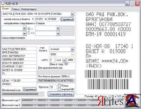Программа RJD - новая версия программы для генерации билетов электричек! Программа является универсальной и самодостаточной, для её нормальной работы не требуется ни каких изменений, для улучшения и ускорения взаимодействия пользователя и программы предусмотрен ввод постоянных данных через текстовые файлы. Добавлен сканер (позволяет создать шаблон билета для использования в любом городе). Теперь созданные программой билеты можно использовать даже для турникетов! Версия: 2.8 Язык: Русский Лукарство: Free Язык интерфейса: русский Системные требования:Любой компьютер