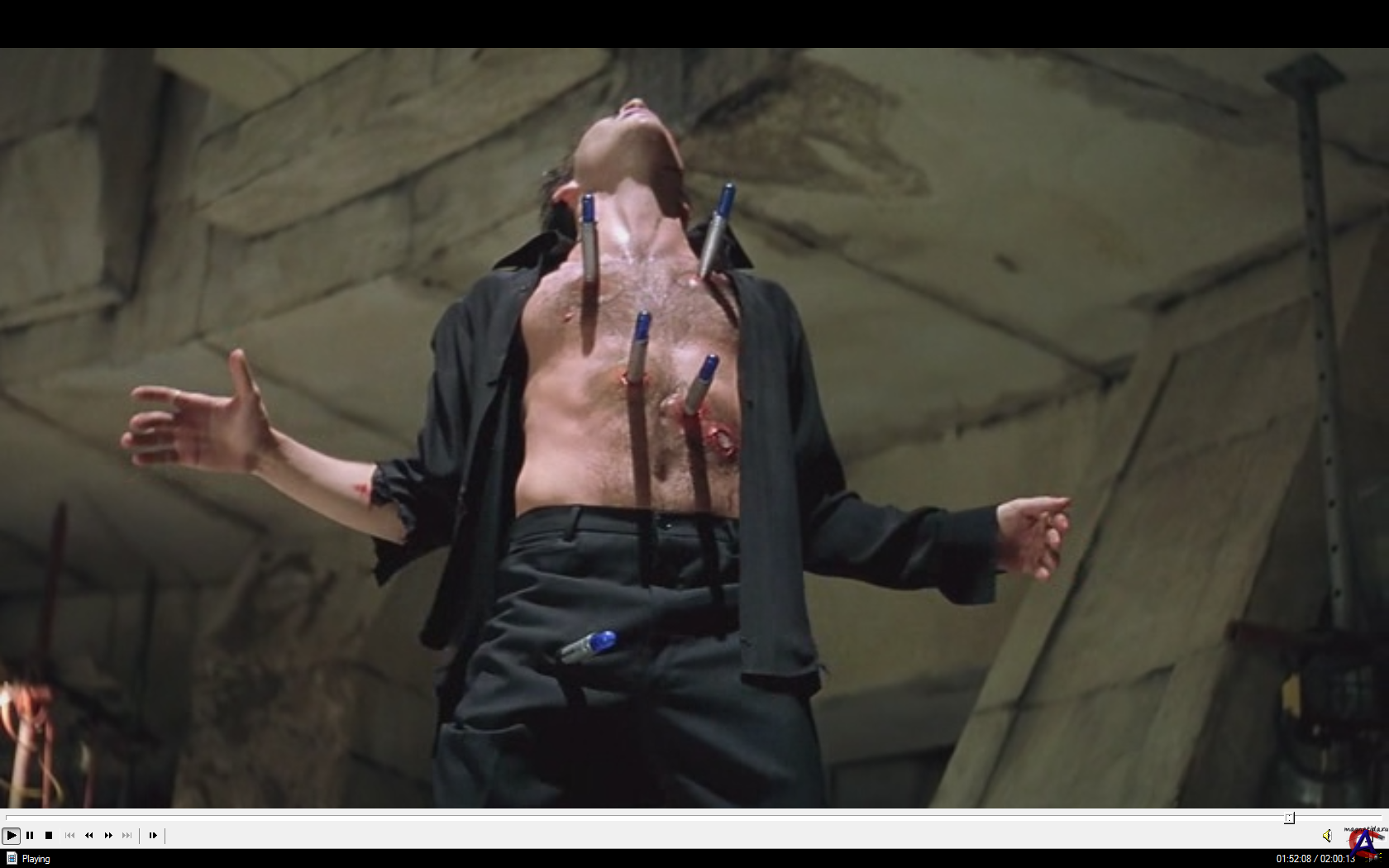 Качество: DVDRip Видео кодек: 720x400 (1.80:1), 23.976 fps, XviD MPEG-4 ~1824 kbps avg, 0.26 bit/pixel Аудио кодек: #1: 48 kHz, AC3 Dolby Digital, 3/2 (L,C,R,l,r) + LFE ch, ~384 kbps Продолжительность: 02:00:13 Перевод: Русский, Дублированный Формат: AVI Информация о фильме: Полу-человек — полу-вампир Блэйд намерен уничтожить виновника своей судьбы — Дьякона Фроста. Когда — то в кровь Блэйда попало совсем немного вампирского яда, но с течением времени он стал ощущать неизбежность своего превращения. Желая избавить людей от тайной и могущественной армии вампиров, заполонившей общество, он отправляется на решающий бой…