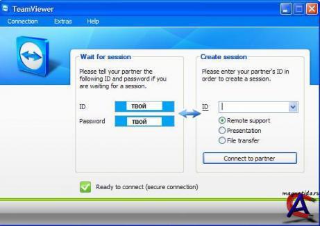 TeamViewer - программа для получения доступа к удаленному компьютеру, причем возможен обход файрволлов и NAT прокси. TeamViewer позволяет получить доступ к компьютеру из любой точки интернета (IP-адрес удаленной машины можно не знать, но на втором комьютере тоже должна быть эта программа). Кроме доступа к рабочему столу и управления удаленным компютером, можно передавать файлы, устраивать презентации, помогать настроить компьютер, общаться в чате и т.д. Что нового в версии 4.0: * One of the main additions to TeamViewer 4 is the new web browser based access mode that allows remote access to another computer via a web browser * Remote control is done by an Adobe Flash 9 component, TeamViewer 4 web connector does not need any ActiveX etc. component and by that will also be usable in high-security environments where browser plugins and executable files are not allowed. * The web connector requires a free TeamViewer account. * The web connector will not be included in the Business licenses Установка: 1.Кликаем TeamViewer_Setup.exe 2.Устанавливая соглашаемся с лицензионным соглашением и с тем, что мы эту программу будем использовать не в коммерческих целях, а на благо общества. 3. Кликаем файл TeamViewer-ru-RU-WindowsXP-Build-4.0-5421.exe, устанавливаем русификатор. 4. Запускаем и пользуемся.