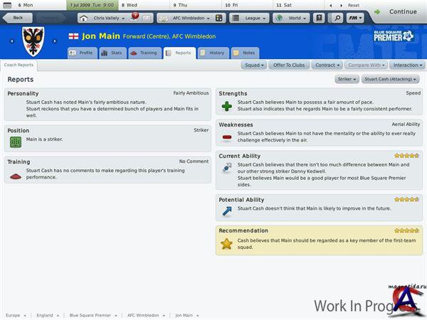 Football Manager 2010 Sports Interactive SEGA® Europe Ltd. Объявляет о том, что Football Manager 2010 для PC и Apple Macintosh, и Football Manager 2010 для Sony PSP будет выпущен 30 октября. Football Manager 2009 – наиболее успешный футбольный менеджер серии на сегодняшний день, продержавшийся 22 недели на № 1 в Великобритании (PC рейтинг) и имеющий продажи более 1 миллиона экземпляров по всему миру, также являющийся 2ой лучшей видео-игрой за все время в одном из недавних опросов Radio 1. Согласно данным, собранным из Football Manager 2009 году, люди играли в игру в среднем 240 часов, и разработчики Sports Interactive провели последние годы работы в тесном контакте с потребителями и комьюнити, дабы улучшить реализацию улучшений в этом году в игре. Нововведения Football Manager 2010 коснулись всех направлений, включая несколько крупных новшеств для повышения удобства использования, навигации,и обратную связь с игрой (введение новой системы тактики матча), новинка – Система аналитики матча. А также можно отметить абсолютно новый взгляд на пользовательский интерфейс. "Мы долго работали с комьюнити не только ради того, что нужно исправить, но и ради деталей, которые мы можем улучшить . Мы провели обширные исследования удобства интерфейса, который привел нас к реорганизации всей системы, и, надо сказать, мы довольны тем, что получилось ", сказал Майлс Джейкобсон, директор студии на Sport Interactive. "Было много работы по уже существующим областям игры, и это также помогало нам вносить изменения, дабы ответить на некоторые из отзывов. Мы уверены в том, что закончив, мы получим лучший Football Manager в октябре ". Внедрение «создателя тактики» упрощает получение того тактического рисунка, которого ожидает менеджер , так же как и введение «подсказок игрокам» и быстрая возможность изменения тактики позволят мгновенно сообщить изменить стиль игры вашей командыво время матча. При содействии наставников, представляющих весь многоуровневый футбол, а также многоуважаемых независимых тактиков из числа фанатов ФМ, игра теперь имеет обширный набор предустановленных тактических шаблонов позволяя пользователю выбрать роль игрока в игре команде (например, "Разрушающий полузащитник"или"остроатакующий плеймейкер»), однако возможность использования старых ползунков никуда не делась. Отчеты с матчей также были улучшены, дабы дать пользователю лучше понять, когда их команда действует в ошибочном или правильном направлении. Новый инструмент анализа матча позволяет увидеть где удары, передачи, забегания,борьба в воздухе, фолы и перехваты были совершены, причем это возможно для всех игроков на поле. Менеджеры могут просматривать это как прямо в ходе игры, так и после матча, что позволит им выявить сильные и слабые стороны Football Manager 2010 имеет новый пользовательский интерфейс, с возможностью выбора легкого и темного оформления. Этому послужило и изменение в системе навигации. Боковая навигации из предыдущих версий была заменена на систему вкладой в верхней части экрана, в результате чего во время игры в Football Manager легче ориентироваться, и это сделает игру более доступной для новых игроков. Измененный редактор позволит добавлять новые дивизионы в существующие лиг и в новых лигах, заметно проще проводить обновление базы данных. Предоставление информации для менеджера была усовершенствована при содействии пользователей. Будет возможно делать Подписку Новостей, то ес