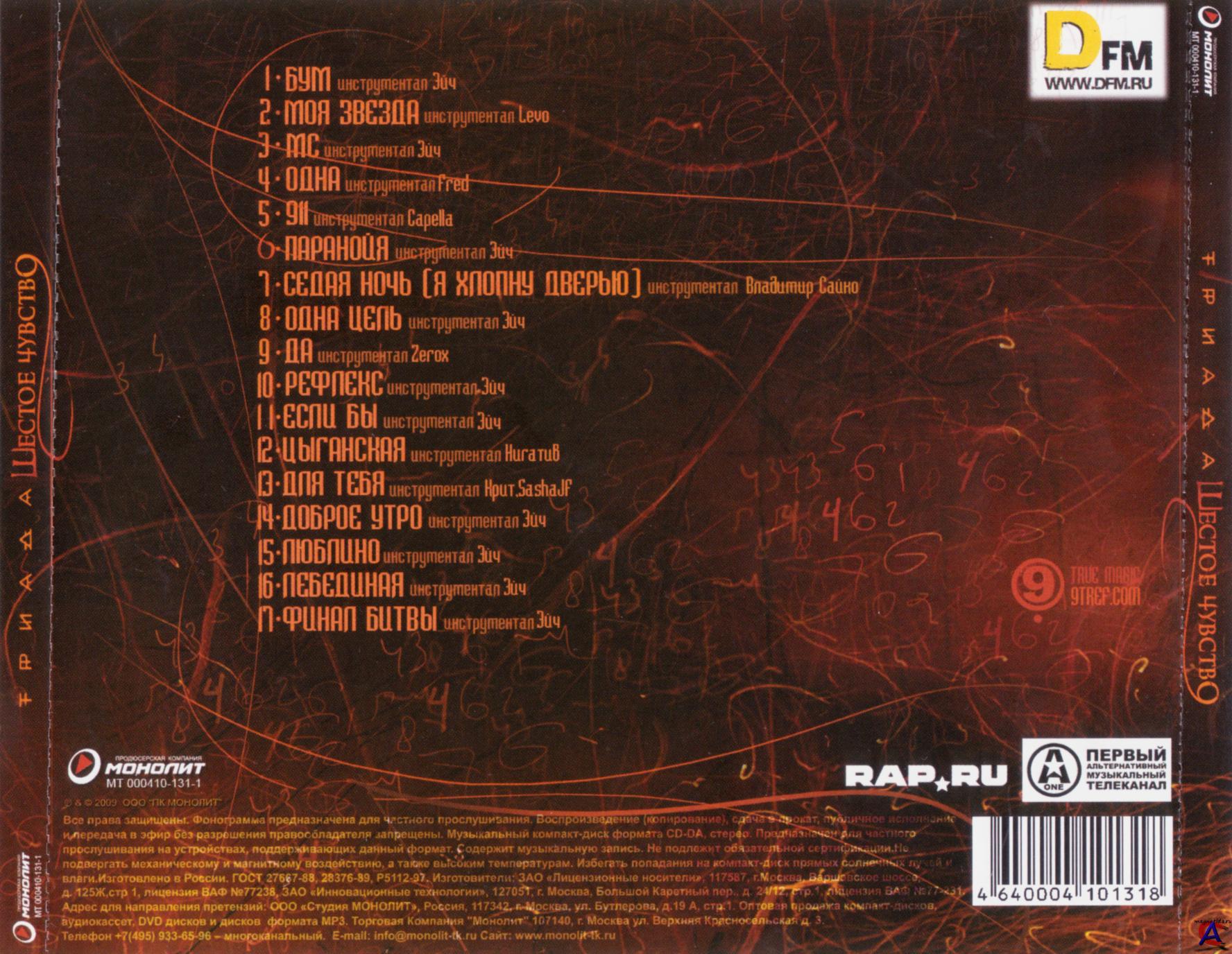 Артист: Триада Название: Шестое Чувство Дата релиза: 2009 Стиль: RUS RAP Размер файла: 143 МБ Кол-во песен: 17 Качество: MP3 (44 kHz/320 kbps) Треклист: 01. Бум (Feat. СВО, PLC) 02. Моя Звезда (Feat. МЕРС) 03. МС 04. Одна 05. 911 (Feat. Mary Jane) 06. Паранойя 07. Седая Ночь (Я Хлопну Дверью) (Feat. Тати) 08. Одна Цель 09. Да 10. Рефлекс (Feat. Хаак) 11. Если Бы 12. Цыганская 13. Для Тебя (Feat. Крит) 14. Доброе Утро 15. Люблино (Feat. Nady (Mary Jane)) 16. Лебединая 17. Финал Битвы