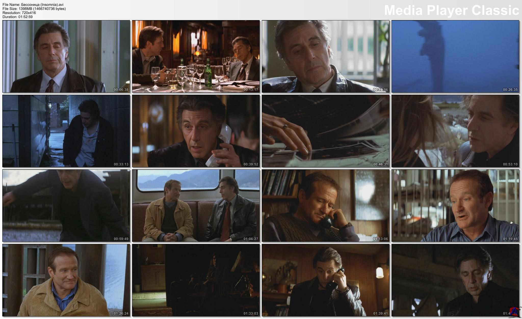 Качество: DVDRip Видео кодек: 720x416 (1.73:1), 25 fps, DivX Codec 6.5.1 ~1276 kbps avg, 0.17 bit/pixel Аудио кодек: 48 kHz, AC3 Dolby Digital, 3/2 (L,C,R,l,r) + LFE ch, ~448 kbps Продолжительность: 01:52:59 Перевод: Русский, Дублированный Формат: AVI Информация о фильме: Опытный детектив полиции Лос-Анджелеса Уилл Домер вместе со своим напарником направлен в маленький городок на Аляске, чтобы расследовать убийство семнадцатилетней девушки. Помощником Дормера также становится проницательный детектив местной полиции Элли Бур.Расследование продвигается, и скоро у полицейских появляется подозреваемый. Это Уолтер Финч (Робин Уильямс) человек романтического склада характера, ведущий уединенный образ жизни. Напарник Дормера погибает во время одного из полицейских дежурств на пустынном скалистом берегу.Эта случайная смерть лишает Дормера сна. Все больше запутываясь в сетях махинаций Финча, Дормер рискует потерять не только сон этими белыми летними ночами
