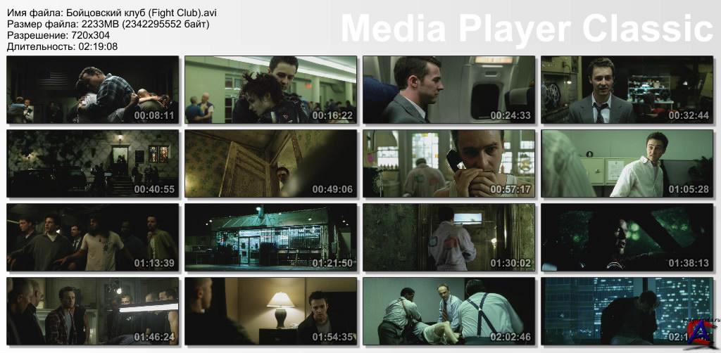 Качество: DVDRip Формат: AVI Видео кодек: DivX Аудио кодек: AC3 Видео: 720x304 (2.50:1), 25 fps, DivX Codec 5.2.1 build 1328, 1765 kbps avg, 0.34 bit/pixel, 1689.65 Mb Аудио: 48 kHz, AC3 Dolby Digital, 3/2 (L,C,R,l,r) + LFE ch, 384.00 kbps avg, 2:13:25.817 / 366.48 Mb Продолжительность: 2:13:25 часминсек Перевод: Профессиональный (полное дублирование) Русские субтитры: нет Терзаемый хронической бессоницей и отчаянно пытающийся вырваться из мучительно скучной жизни клерк встречает некоего Тайлера Дардена, харизматического торговца мылом с извращенной философией. Тайлер уверен, что самосовершенствование — удел слабых, а саморазрушение — единственное, ради чего стоит жить. Пройдет немного времени, и вот уже главные герои лупят друг друга почем зря на стоянке перед баром, и очищающий мордобой доставляет им высшее блаженство. Приобщая других мужчин к простым радостям физической жестокости, они основывают тайный Бойцовский Клуб, который имеет огромный успех. Но в концовке фильма всех ждет шокирующее открытие, которое может привести к непредсказуемым событиям…