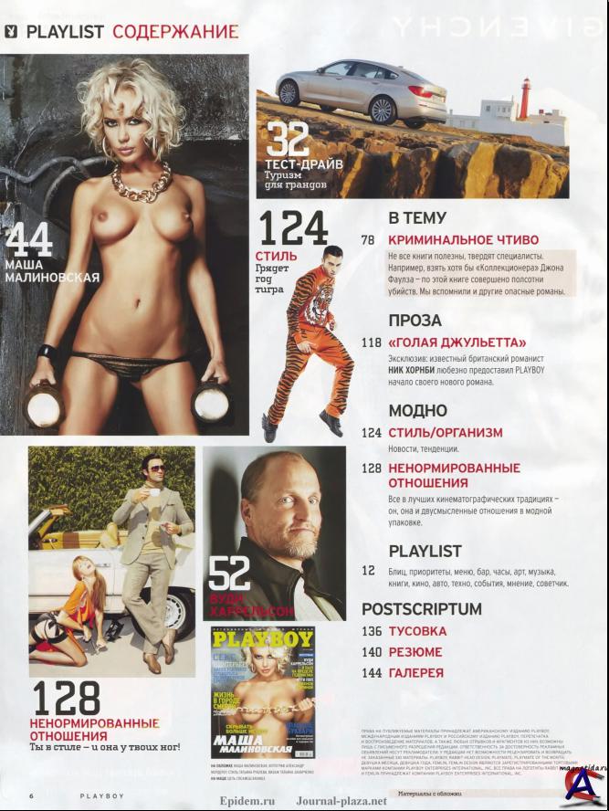 Номер: 12 Месяц / Год: Декабрь/2009 Страниц: 107 Формат: PDF Размер файла: 75 Мб Язык: Русский Содержание: В КАДР МАШЕ ВСЕ! МАША МАЛИНОВСКАЯ славится, помимо всех своих достоинств, чувством юмора и иронией. Пока Машу фотографировали в обнаженном виде, она иронично рассказала о преимуществах блондинок. ХОЛМЫ И ЛУНКИ Playmate ЛЕРА РОЗОВА увлеклась благородным занятием, гольфом. И сделала игривей благородную и неспешную игру. ГРЯЗНЫЕ ТАНЦЫ У культового фильма с Патриком Суэйзи был бы иной финал, если бы главная женская роль в нем досталась ИЛОНЕ СЕРОЙ. ИНТЕРВЬЮ ДЗЕН-ВУДИЗМ Актер ВУДИ ХАРРЕЛЬСОН на экране предсказывает конец света в кинокатастрофе «2012» и вырезает полчища живых мертвецов в «Зомби ленде». В жизни же он далек от фатализма. Вуди - за гедонизм и просветление. ВОЗДУШНЫЕ ТРЕВОГИ Участник группы AIR НИКОЛЯ ГОДЭН рассказал PLAYBOY о загульной юности, пьяной старости, а также деньгах и, конечно, девочках. В ТЕМУ СИДИТЕ, СИДИТЕ! Кресло - вот на что должна обратить красавица внимание, как только переступит порог твоего дома. Мы почти все устроили, подобрав и девушек, и мебель. Окончательное решение - за тобой! ЖИЗНЬ В ГОРОДЕ СМЕРТИ Каждый из миллиарда индусов мечтает закончить свои дни или сжечь тело именно в Варнаси. Тогда душе будет вечное счастье. КРИМИНАЛЬНОЕ ЧТИВО Не все книги полезны, твердят специалисты. Например, взять хотя бы «Коллекционера» Джона Фаулза - по этой книге совершено полсотни убийств. Мы вспомнили и другие опасные романы. ПРОЗА «ГОЛАЯ ДЖУЛЬЕТТА» Эксклюзив: известный британский романист НИК ХОРНБИ любезно предоставил PLAYBOY начало своего нового романа.