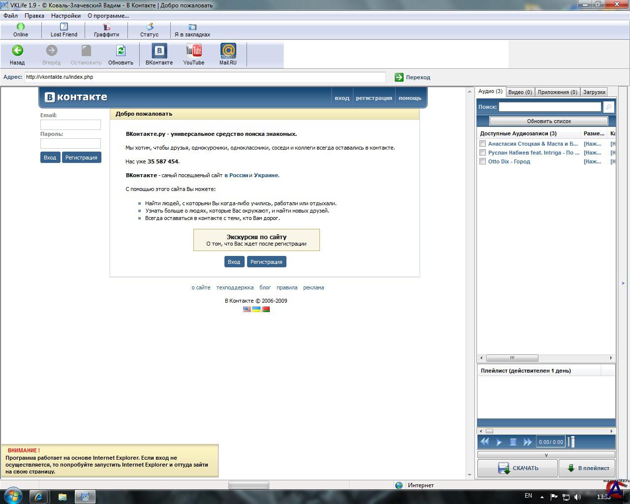 VKLife версия 1.9 - универсальная программа для скачивания музыки, видео и приложений с сайта ВКонтакте.РУ, YouTube.com, Mail.RU и Мой Мир@mail.ru Что нового в последней версии VKLife? После изменений на сайте ВКонтакте.РУ переписаны функции, против которых была включена защита путём автоматической сменой пароля; Особенности VKLife: - скачивание аудио, видео и приложений с сайта Вконтакте.РУ и YouTube.com, Mail.RU и Мой Мир@mail.ru; - вставка изображений на стену пользователя или группы. В отличие от других программ и онлайн сервисов не требуется вводить личные данные и пароль; - возможность писать многострочный статус; - встроенный аудиоплеер - удобно слушать музыку, путешествуя по просторам Контакта; - если Вас кто-то удалил из друзей программа сверит списки и скажет кто это был; - уведомление о новых сообщениях ВКонтакте.Ру - Вам не придётся каждый раз обновлять страницу для проверки наличия новых сообщений; - поддержка Прокси-сервера; Программа легка в использовании и абсолютно БЕСПЛАТНА!
