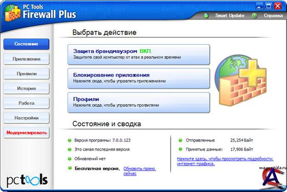 Версия программы: 7.0.0.123 Язык интерфейса: ML-RU ОС: Windows XP | Vista | 7 Лекарство: Не требуется PC Tools Firewall Plus – это бесплатный, простой в использовании, но эффективный персональный брандмауэр для Windows®, защищающий информацию, хранящуюся на вашем компьютере, от несанкционированного доступа из локальных сетей или Интернета. Контролируя работу различных приложений, Firewall Plus пресекает попытки троянов, бэкдоров, клавиатурных шпионов и прочих вредоносных программ нанести ущерб компьютеру и похитить вашу конфиденциальную информацию. Передовая технология PC Tools Firewall Plus была специально разработана таким образом, чтобы программой могли пользоваться не только специалисты, но и рядовые пользователи. Мощная защита от атак и вредоносных программ активируется по умолчанию. Все, что вам нужно сделать - это инсталлировать программу, и ваш компьютер немедленно окажется под постоянной защитой. Опытные пользователи могут также создавать свои собственные усложненные правила фильтрации пакетов, включая поддержку IPv6, чтобы настроить сетевую защиту по своему усмотрению. Защита компьютера программой PC Tools Firewall Plus считается непревзойденной: она обеспечивается системой регулярных обновлений, охранными модулями, работающими в режиме реального времени и комплексным подходом к вопросам безопасности. Ваш компьютер всегда защищен, ему не страшны никакие хакеры. Миллионы людей ежедневно пользуются программами PC Tools, чтобы защитить свои домашние и офисные компьютеры от сетевых угроз. Основные особенности PC Tools Firewall Plus: Скрывает ПК от хакеров. Подробный контроль входящего и исходящего трафика. Простота использования - программа предназначена как для опытных, так и для начинающих пользователей. Возможность создания дополнительных правил для повышения уровня защиты ПК от распространенных видов атак. Возможность защиты правил и настроек паролем. И, кроме того, программа БЕСПЛАТНА. Никаких уловок, никаких функциональных или временных ограничений. PC Tools Firewall Plus - бесплатная программа, но требует прохождения регистрации (бесплатной) на сайте разработчика в течение 30 дней после установки. Программа PC Tools Firewall Plus вошла с список "Лучшие бесплатные программы"