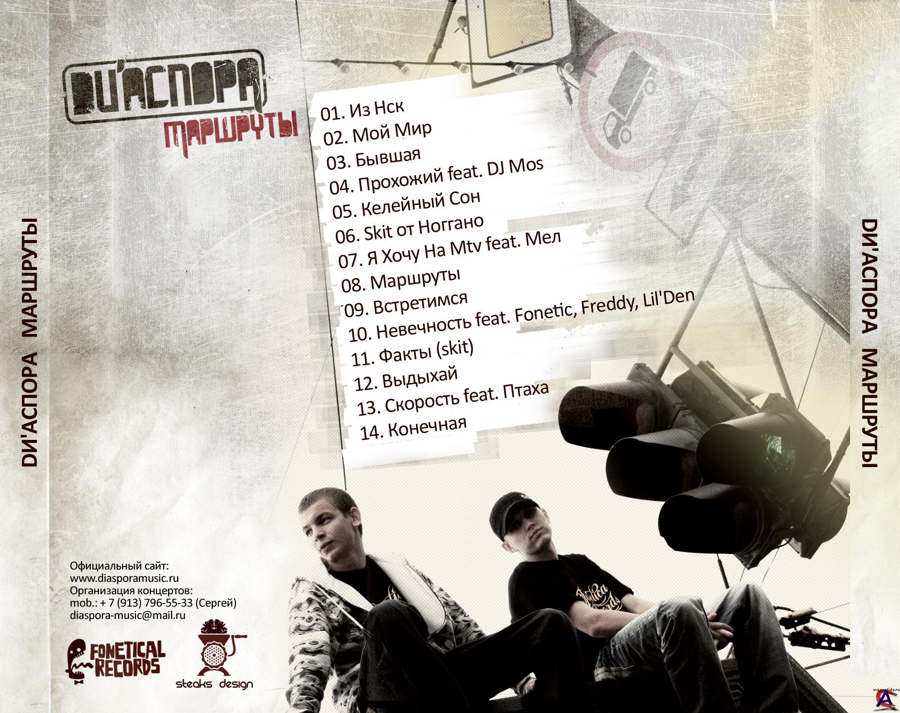Формат: MP3 Качество: 320 кб/с Создание диска длилось с момента образования группы DИ"АСПОРА (2006г.). За это время произошло множество разных событий и переездов, поэтому альбом получил название "Маршруты". На альбоме так же приняли участие Fonetic и Lil"Den (Lissen2), Мел и Freddy (R.P.), Птаха (Centr). Из всего записанного материала мы отобрали 12 лучших трэков, добавили к ним 2 скита и получили именно тот альбом, который мы хотели: простой, со смыслом и от души. Трэк-лист: 1. Из Нск 2. Мой Мир 3. Бывшая 4. Прохожий (feat. DJ Mos) 5. Келейный Сон 6. Skit от Ноггано 7. Я Хочу На Mtv (feat. Мел) 8. Маршруты 9. Встретимся 10. Невечность (feat. Fonetic, Freddy, Lil"Den) 12. Выдыхай 13. Скорость (feat. Птаха) 14. Конечная