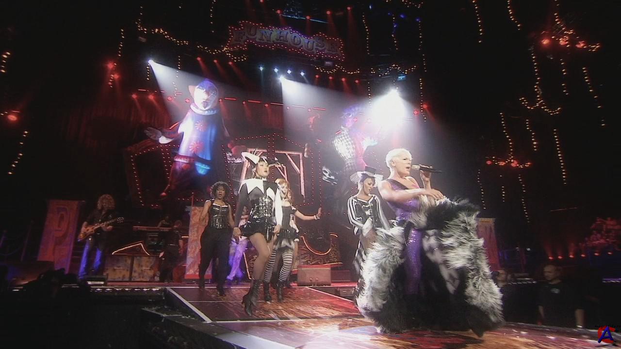 Качество : BDrip Format : Matroska File size : 7.96 GiB PlayTime : 1h 55mn Bit rate : 9888 Kbps Video Codec : AVC Width : 1280 pixels Height : 720 pixels Display Aspect ratio : 16/9 Frame rate : 23.976 fps Language : English Audio Codec : DTS PlayTime : 1h 55mn Bit rate : 1536 Kbps Channel(s) : 6 channels Channel positions : Front: L C R, Surround: L R, LFE Sampling rate : 48.0 KHz Resolution : 24 bits Снятый в Сиднее, Австралия, последняя работа Pink представляет один из лучших туров 2009, со фрагментами от всех ее альбомов. Двухчасовой показ цирка-themed показывает удивительные сценические шоу с балеринами, зеркалами, клоунами и воздушными акробатами. Окружением всего этого - является Pink и ее удивительный голос. Вы услышите живые версии от ее альбома Funhouse как, "Пожалуйста не Оставляйте Меня" и "Так Какой", так же как большая акустическая версия "Проблемы". "Шоссе AC/DC к черту" и "Богемской Рапсодии Королевы" являются фантастическими исполнениями музыкального вдохновения Pink. Данный фильм не оставит вас равнодушным,даже ,если вы не являетесь её ярым поклонником