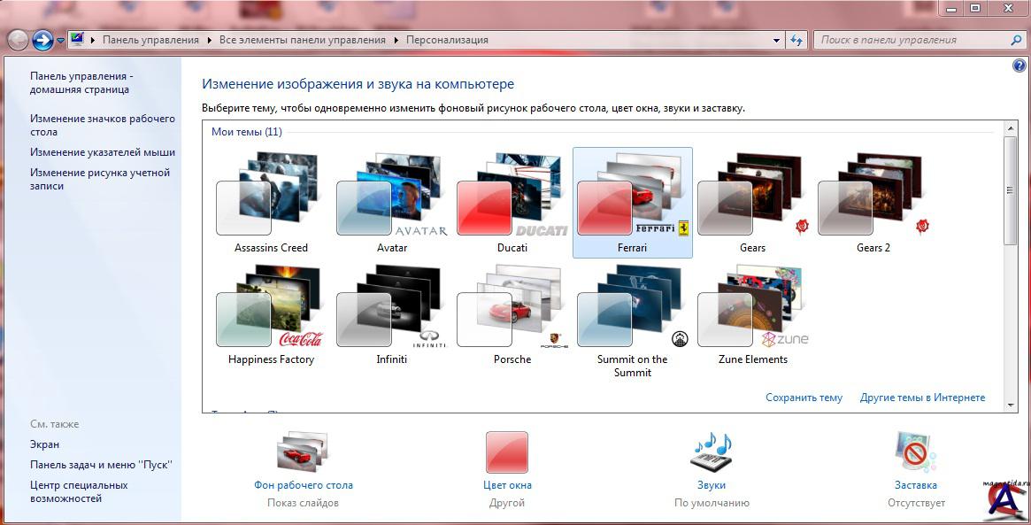 Что такое тема? Тема - это объединение изображений, цветов и звуков компьютера. Она включает в себя фон рабочего стола, заставку, цвет границы окна и звуковую схему. Некоторые темы могут также содержать значки рабочего стола и указатели мыши. Список тем: 1)Avatar 2)Coca-Cola 3)Gears of War 4)Gears of War 2 5)Элементы Zune 6)Assassin"s Creed 7)Ferrari 8)Infiniti 9)Porsche 10)Summit on the Summit 11)Ducati Внимание! Темы применяются только в Windows 7!