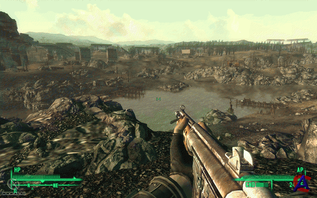Но вернемся к оформительским элементам. Поначалу Fallout 3 впечатляет. Многие рецензенты уже говорили о том, что момент выхода из убежища сродни моменту выхода из канализации в Oblivion. И мы с ними согласимся. Только добавим, что чувства испытываешь несколько иные. Если в Сиродиле вы испытали восторг с восхищением, то здесь скорее тот же восторг, но уже с некоторой внутренней тревогой. Скорее всего, вы сразу же обратите внимание, что визуально Fallout 3 - облагороженный Oblivion. Да, текстуры стали лучше, да добавилось детализации. Но, все же, это уровень 2006-го года! Симпатично, но уже далеко не сногсшибательно. А иногда, когда присмотришься, понимаешь, что даже откровенно плохо.