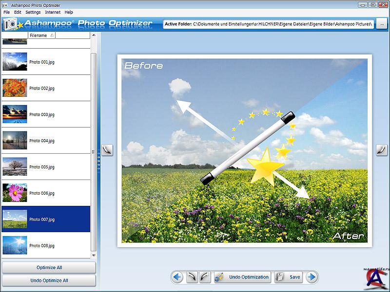 Версия: 3.10 Разработчик: Ashampoo www.ashampoo.com/ Платформа: Windows XP/Vista Совместимость с Vista: полная Язык интерфейса: мультиязынная версия ( выключая русский ) Таблэтка: Присутствует Описание: Ashampoo Photo Optimizer - простая в использовании программа для оптимизации и улучшения качества цифровых фотографий. Утилита позволяет корректировать контрастность, яркость и цветовой баланс. Все действия в программе производятся по нажатию необходимой кнопки на панели инструментов. Также, в данной программе предусмотрена пакетная обработка графических файлов. С помощью этой утилиты, снимки становятся ярче, светлее, приобретают четкость и контрастность. Если сравнивать показатели до и после преображения, заметно, насколько силен программный алгоритм оптимизации. Поработав однажды с этой программой, вы больше не захотите использовать любые другие, во многом – из-за экономии времени. Целые папки с изображениями автоматически просматриваются и преобразовываются. Исходные данные автоматически сохраняются в резервной папке и уничтожаются только когда пользователь полностью удовлетворен преображенными фотографиями. Программа обладает приятным пользовательским интерфейсом с многоязычной поддержкой, включая русский язык. Возможности: Функция мгновенной оптимизации фотографий для придачи блеска изображениям Оптимизация всех ваших фотографий за один клик Удаление эффекта красных глаз Поворот изображения за один клик Конвертация в черно-белый, сепию или инвертирование цветов Быстрая и простая настройка яркости и контраста Автоматическое резервное копирование Запуск программы из проводника Windows
