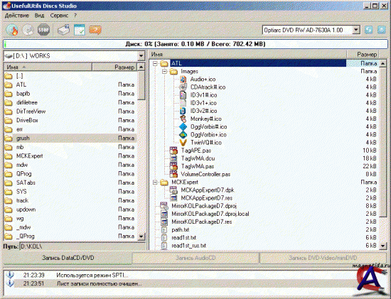 UsefulUtils CD&DVD Discs Studio - программа для записи данных на CDDVD диски, создания полнофункционнальных DVD-Video (miniDVD) и AudioCD дисков в системах Windows 9x/Me/2000/XP/2003. Операционная система: Windows 98/ME/2000/XP/Vista/Seven Язык интерфейса: Русский Тип лицензии: FreeWare Разработчик: MTsv DN Версия: 3.0.2 Основные возможности: - Поддерживает SCSI, ATAPI, Parallel port, USB (1.1 and 2.0) and FireWire (IEEE 1394) устройства - При записи AudioCD поддерживает файлы форматов MP3, WMA, ASF (для Windows 9x нужен кодек), OGG (нужен кодек) и WAV файлы - При записи AudioCD поддерживает TAO, DAO/96 и DAO/16 режимы записи - При записи AudioCD полностью поддерживает CD-Text (пока CD-Text устанавливается программой) - При записи DVD-Video и miniDVD использует файловую систему UDF - Поддерживает запись на CDDVD диски любой емкости - Записывает диски с поддержкой технологий "Записи На Лету", "Защиты Опустошения Буфера". Также существует проверка корректности записанных данных (при записи Digital Storage) - Определяет основную информацию о диске и устройстве - и многое другое... При этом портабельна - установленную версию можно скопировать на флэшку и носить с собой!